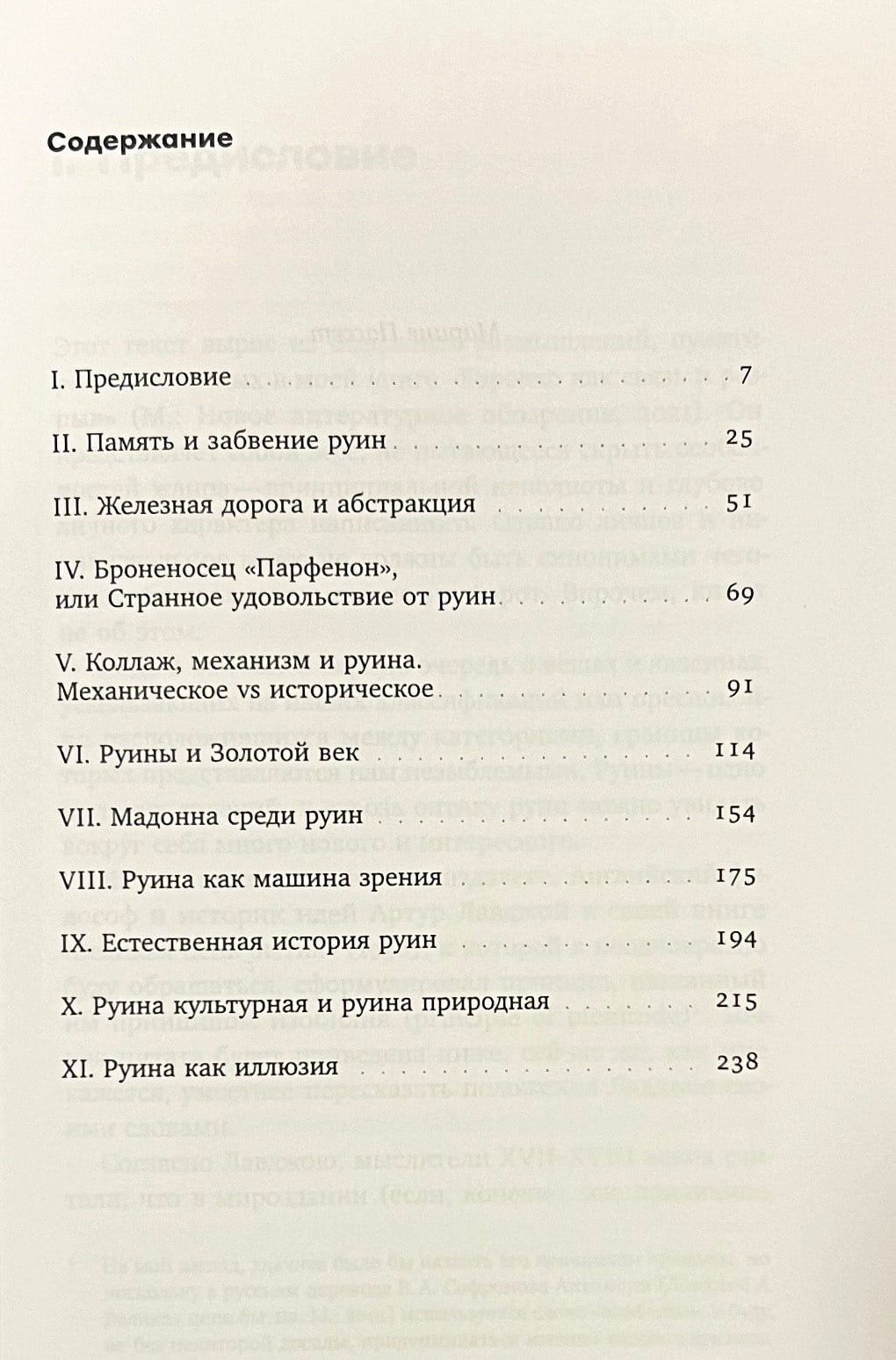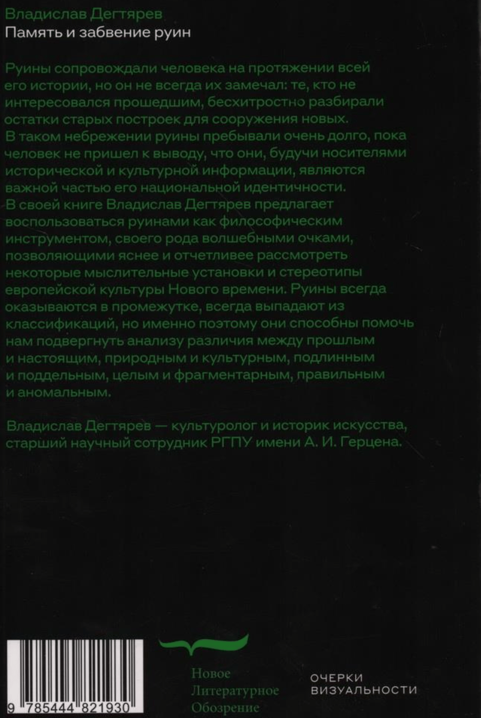 В своей книге Владислав Дегтярев предлагает воспользоваться руинами как философическим инструментом, своего рода волшебными очками, позволяющими яснее и отчетливее рассмотреть некоторые мыслительные установки и стереотипы европейской культуры Нового времени. Руины всегда оказываются в промежутке, всегда выпадают из классификаций, но именно поэтому они способны помочь нам подвергнуть анализу различия между прошлым и настоящим, природным и культурным, подлинным и поддельным, целым и фрагментарным, правильным и аномальным.