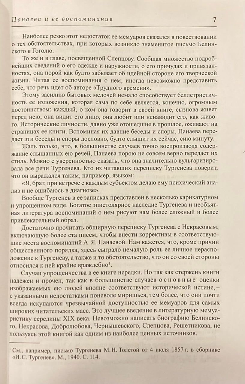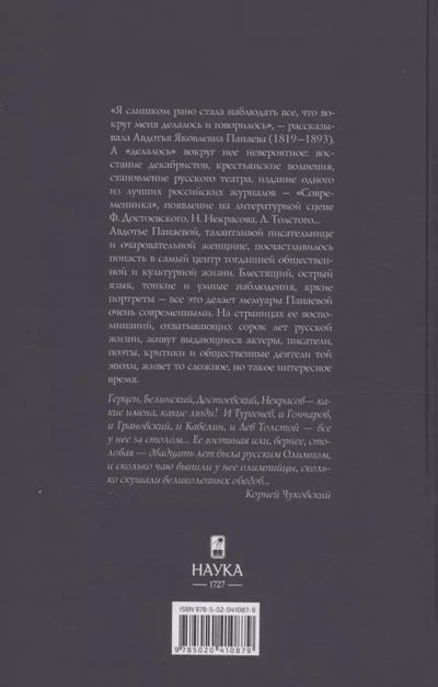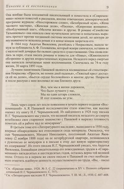 «Воспоминания» Авдотьи Панаевой — книга, позволяющая взглянуть на мир России XIX века глазами женщины. «Воспоминания» выдержаны в тоне повествования, погружают в мир и быт писателей и творческой интеллигенции России XIX века. Лёгкими касаниями, иногда намёками Панаева пишет о том, что её волновало, что было важным для той поры, какие люди её окружали, даёт точные психологические портреты, пропущенные сквозь призму её восприятия — восприятия женщины, родившейся в театральной семье, имеющей литературный талант, постоянно задвигаемой на кухню разливать чай современным ей мужчинам, практически не имевшей собственный голос, но внимающей, впитывающей как губка все их разговоры и имеющей своё мнение по многим вопросам, которое она хоть редко, но высказывала. «Воспоминания» были написаны из-за крайней нужды. Авдотья Яковлевна осталась без средств к существованию и мемуары должны были принести хоть сколько-то денег. Книга много раз исправлялась, подвергалась цензурным правкам. В советских и современных изданиях «Воспоминаний» усилиями историков и исследователей литературы «персоны N» заменены на настоящие имена участников событий, неточности и ошибки по возможности исправлены, а текст восстановлен.