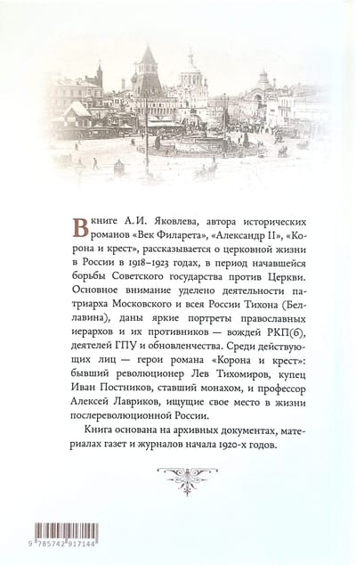 В книге А. И. Яковлева, автора исторических романов «Век Филарета», «Александр II», «Корона и крест», рассказывается о церковной жизни в России в 1918–1923 годах, в период начавшейся борьбы Советского государства против Церкви. Основное внимание уделено деятельности патриарха Московского и всея России Тихона (Беллавина), даны яркие портреты православных иерархов и их противников – вождей РКП(б), деятелей ГПУ и обновленчества. Среди действующих лиц – герои романа «Корона и крест»: бывший революционер Лев Тихомиров, купец Иван Постников, ставший монахом, и профессор Алексей Лавриков, ищущие свое место в жизни послереволюционной России.