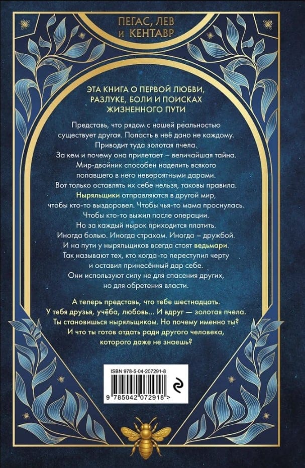Представь, что рядом с нашей реальностью существует другая. Мир–двойник способен наделить всякого попавшего туда невероятными дарами. Вот только оставлять их себе нельзя, как бы сильно они тебе не были нужны. Попасть в такую реальность дано не каждому. Приводит туда золотая пчела. Ныряльщики отправляются в другой мир, чтобы кому-то помочь. Но за каждый нырок приходится платить. И на пути у ныряльщиков всегда стоят ведьмари. Так называют тех, кто когда-то переступил черту и оставил принесённый дар себе. Они используют силу не для спасения других, но для обретения власти. А теперь представь, что тебе шестнадцать. У тебя друзья, учёба, любовь… И вдруг — золотая пчела. Ты становишься ныряльщиком. Но почему именно ты? И что ты готов отдать ради другого человека, которого даже не знаешь?