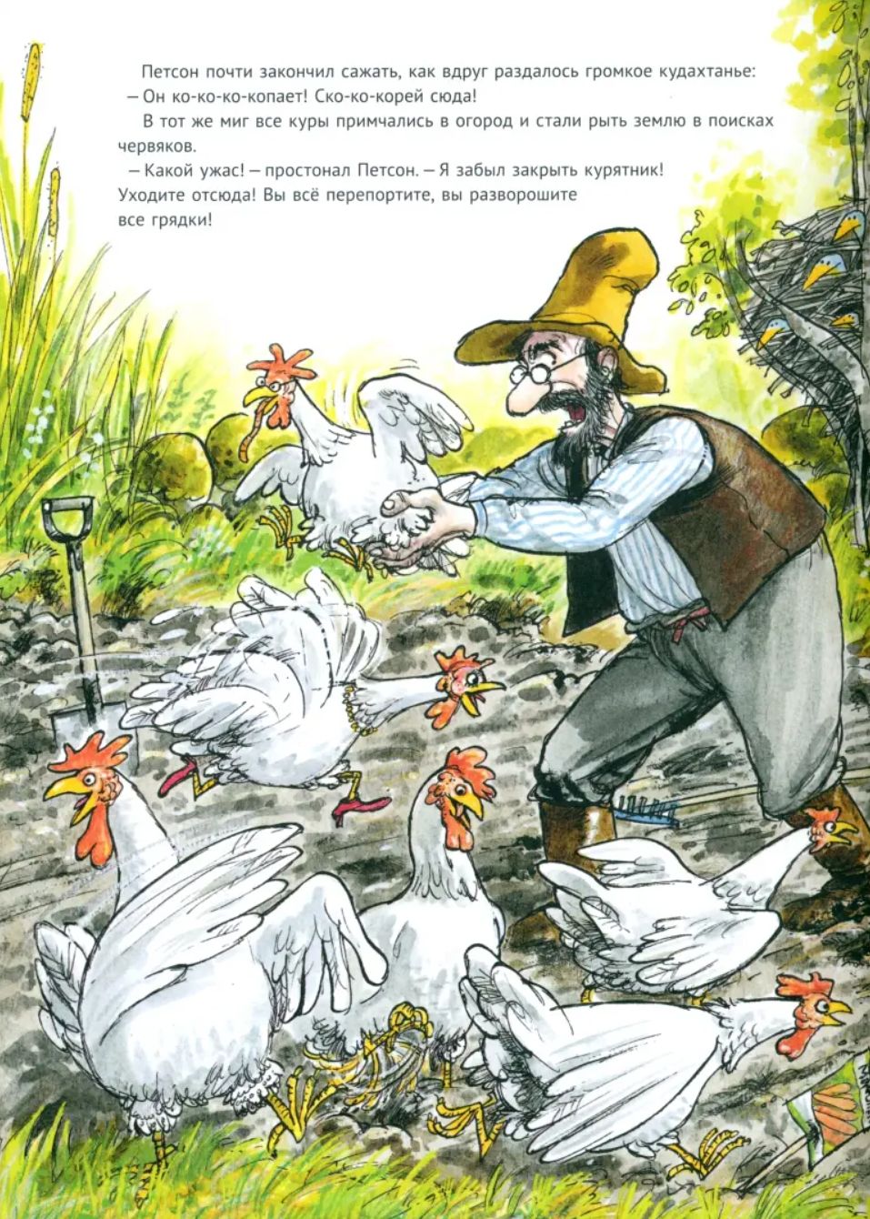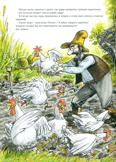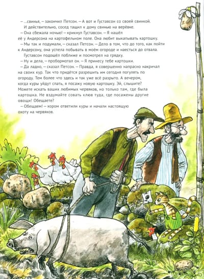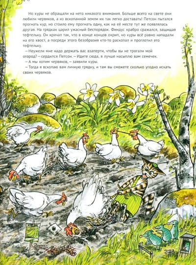 Но у Финдуса было свое мнение о том, чем надо заниматься в огороде. Свое мнение было также у кур и коров. Итак, все идет своим чередом, вернее, не совсем своим.