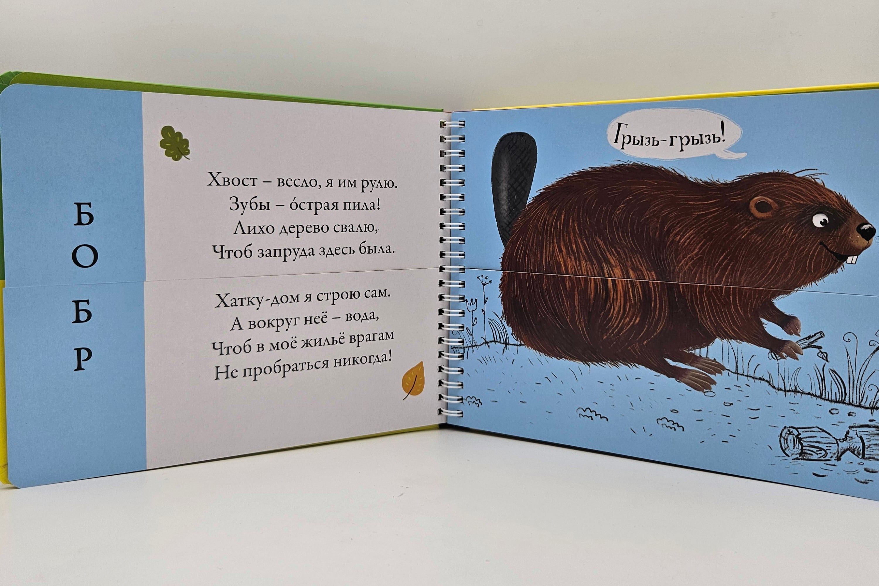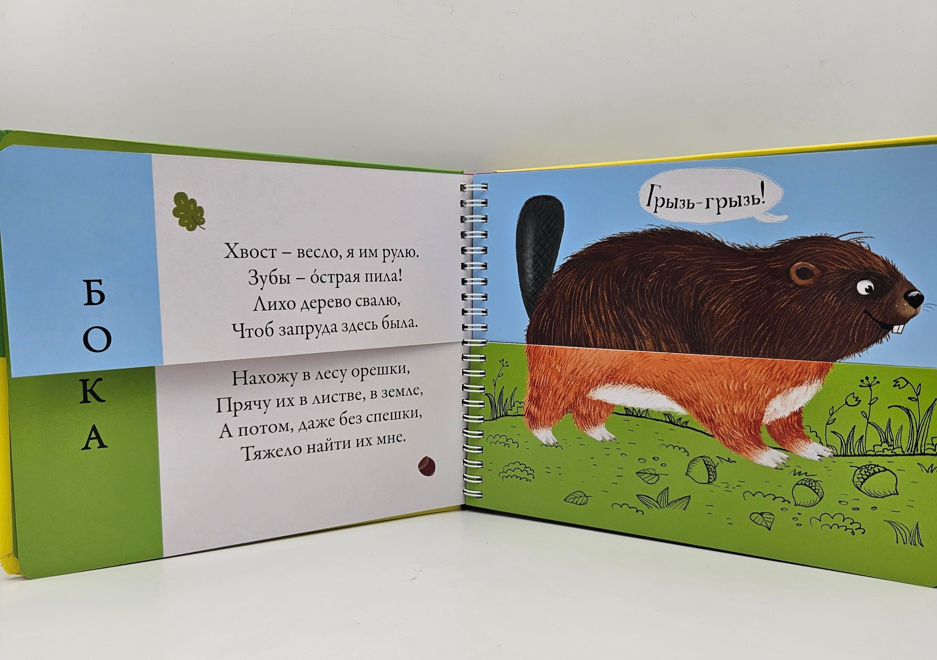 На каждом развороте этой удивительной книги справа находится изображение дикого животного, слева – его стихотворное описание, состоящее из двух четверостиший, в одном из которых описывается внешний вид животного, во втором – его повадки.