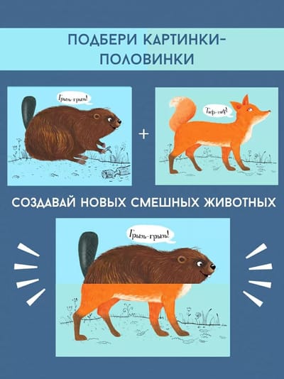 Благодаря конструкции книги, из двух половинок картинки можно сложить 144 животных, а слева при этом сложится его забавное название и описание в стихах.