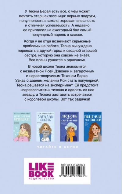 В новой школе Теона знакомится с незаметной Ясей Дзвоник и загадочным и неразговорчивым Тихоном Барко. Узнав о давнем желании Яси стать популярной, Теона решается на эксперимент. Ей предстоит «перевоспитать» тихоню и сделать из нее звезду, а Тихона заставить встречаться с королевой школы. Вот так задачка!