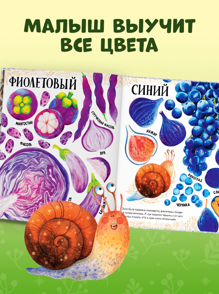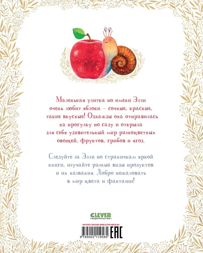 «Приключения улитки Элли в мире фруктов и овощей» — это история малютки, которая жила на яблоне и обожала сладкие яблочки. Но однажды Элли соскользнула с ветки и оказалась на земле! Улитка отправилась в путь и познакомилась с красным арбузом, оранжевой папайей, желтым манго, зеленым лаймом… На каждом развороте малыша ждет новый цвет и удивительно красиво нарисованные фрукты или овощи.