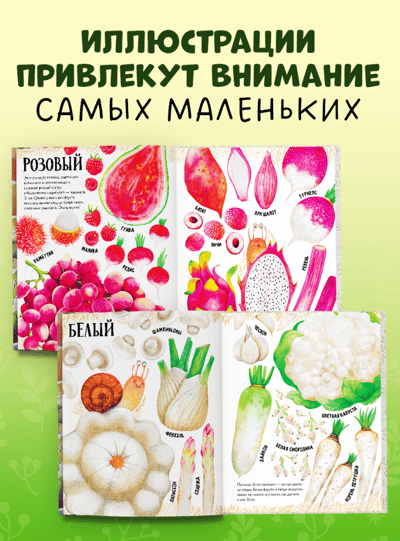 Книга выглядит как визуальный словарь — под каждым рисунком подпись с названием клубники, смородины, банана... Здесь есть не только всем известные яблоки, груши и огурцы, но и редкие артишок и турнепс, и экзотические рамбутан, мангостин и питайя.