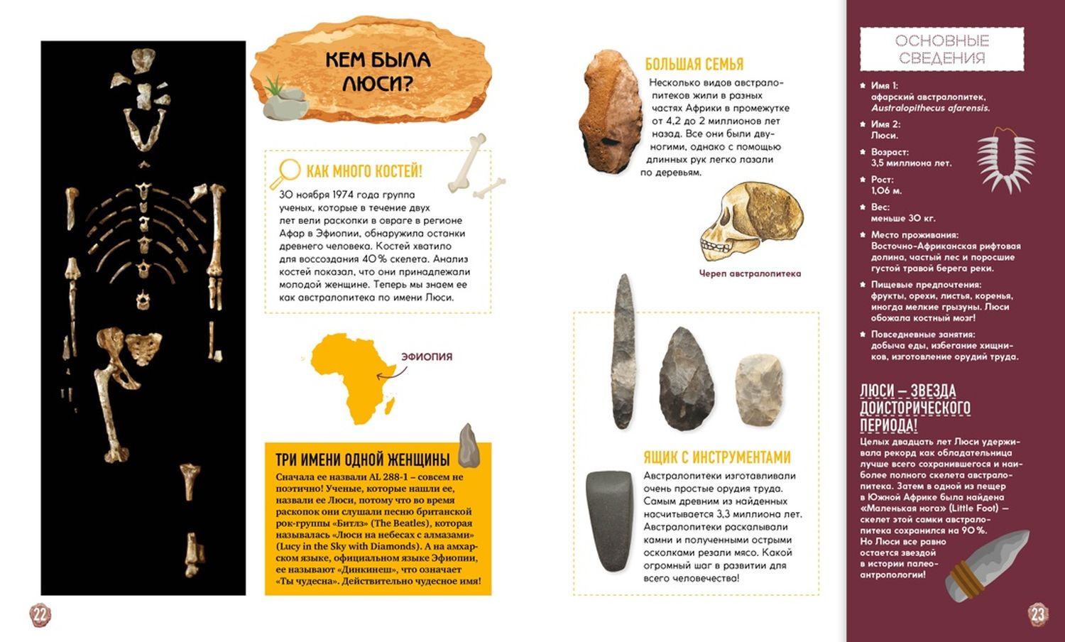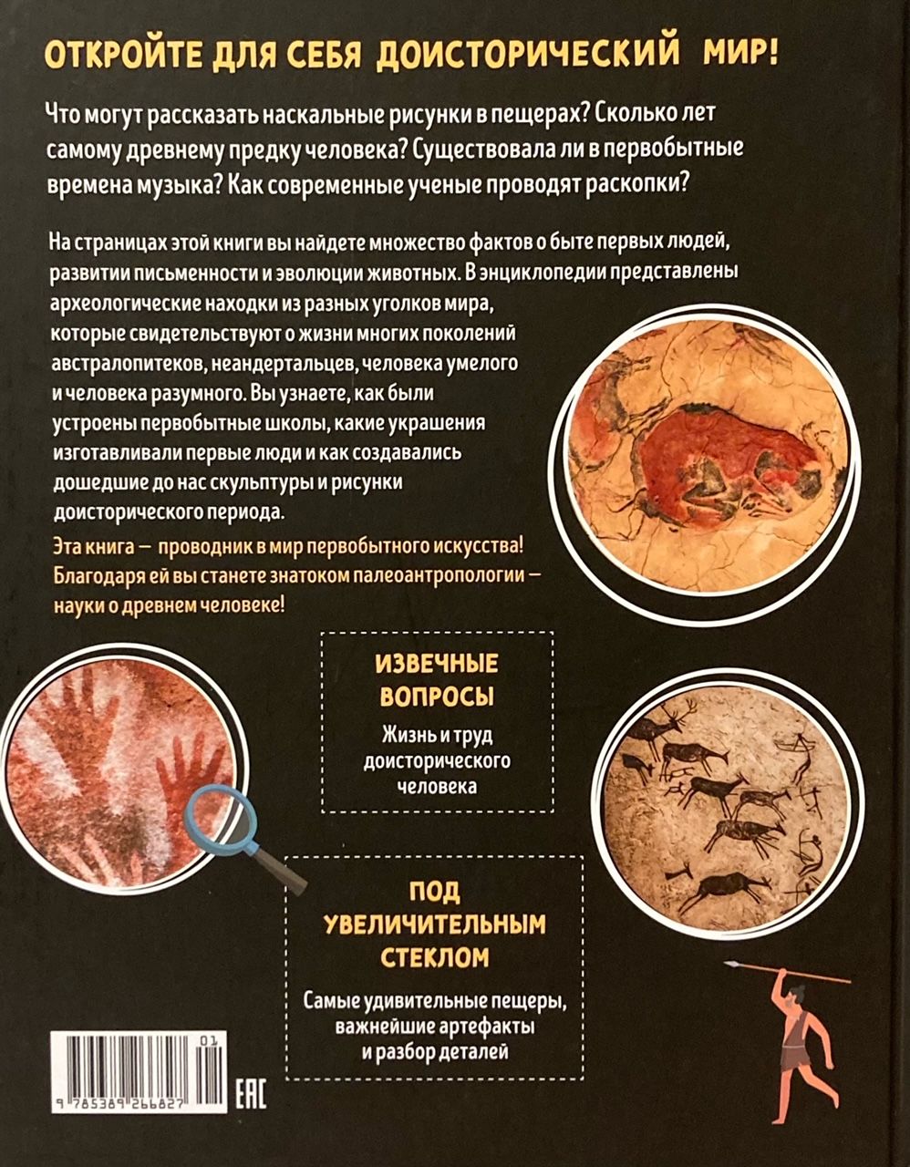 На страницах этой книги вы найдете множество фактов о быте первых людей, развитии письменности и эволюции животных. В энциклопедии представлены археологические находки из разных уголков мира, которые свидетельствуют о жизни многих поколений австралопитеков, неандертальцев, человека умелого и человека разумного. Вы узнаете, как были устроены первобытные школы, какие украшения изготавливали первые люди и как создавались дошедшие до нас скульптуры и рисунки доисторического периода.