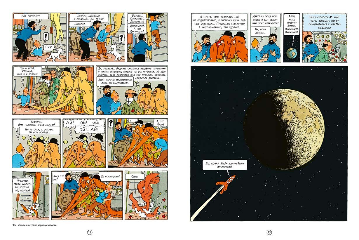 В Центре атомных исследований в сильдавском Сброе состоялся запуск лунной ракеты, на борту которой находятся Тинтин с Милу, капитан Хаддок, профессор Турнесоль и инженер Вольф. С тревогой в ЦУПе ждут, когда первые покорители космоса очнутся после стартовых перегрузок, однако все попытки выйти с ними на связь ни к чему не приводят: ответного сигнала все нет. А где-то далеко в позывные Земли вслушиваются неизвестные: для них лунная миссия представляет не только научный интерес... Так начинается вторая часть лунного триллера, который до последних страниц держит читателя в напряжении. Из трюма вылезают детективы Дюпонт и Дюпонд, очутившиеся на борту по нелепой случайности; инженер Вольф оказывается не тем, за кого себя выдавал. И непрерывная череда других событий ставит под вопрос саму возможность благополучного возвращения героев на Землю.