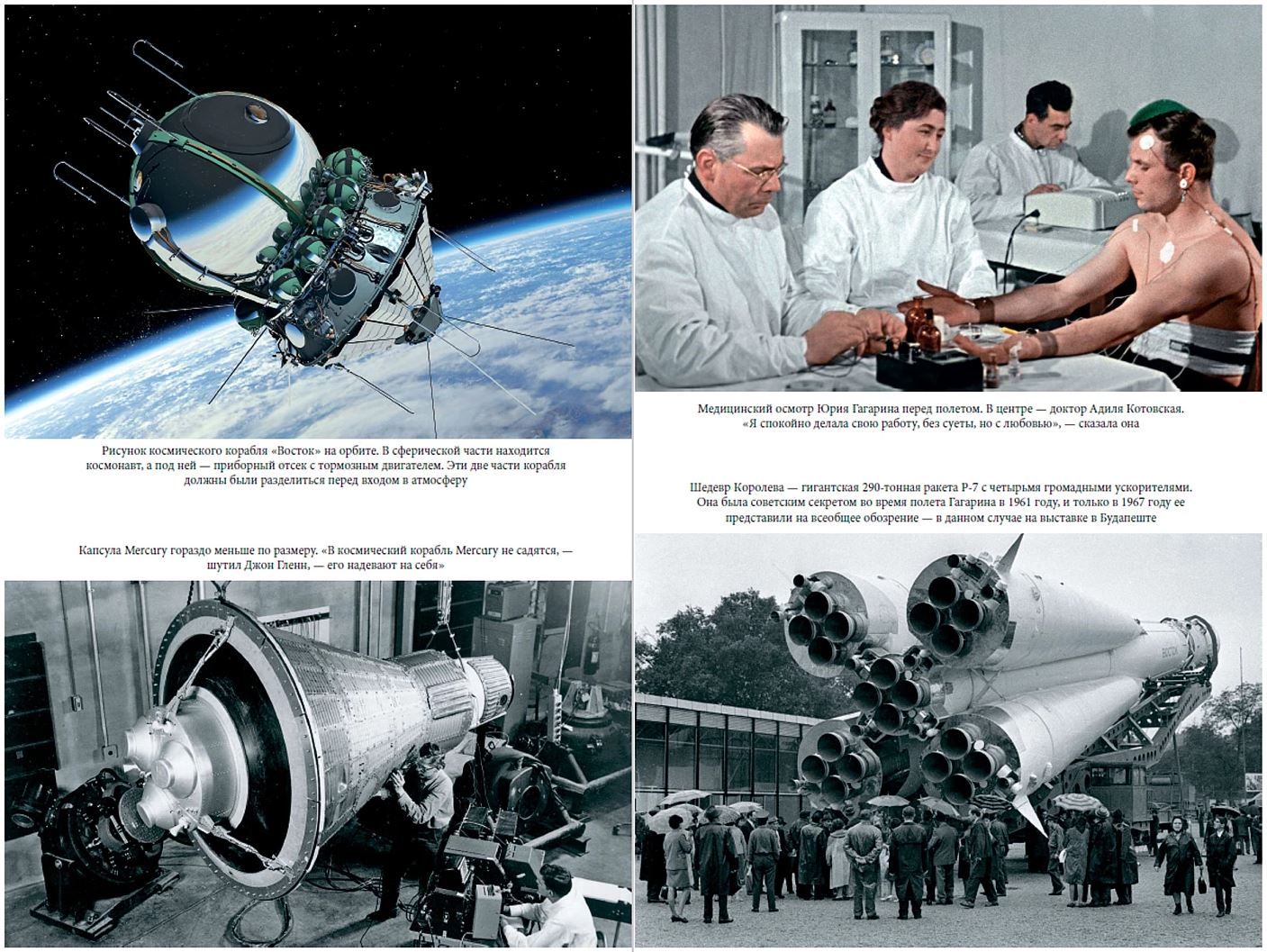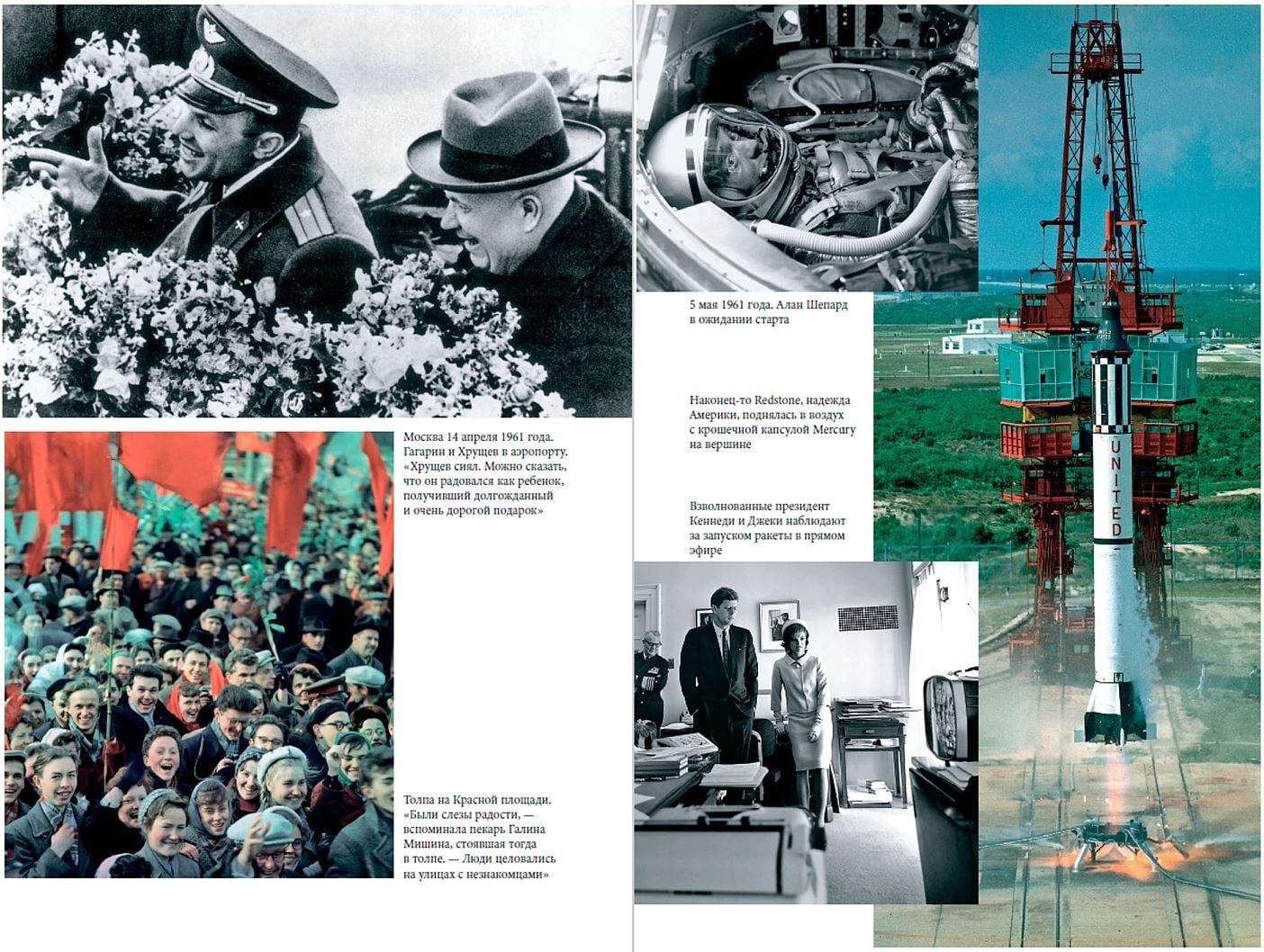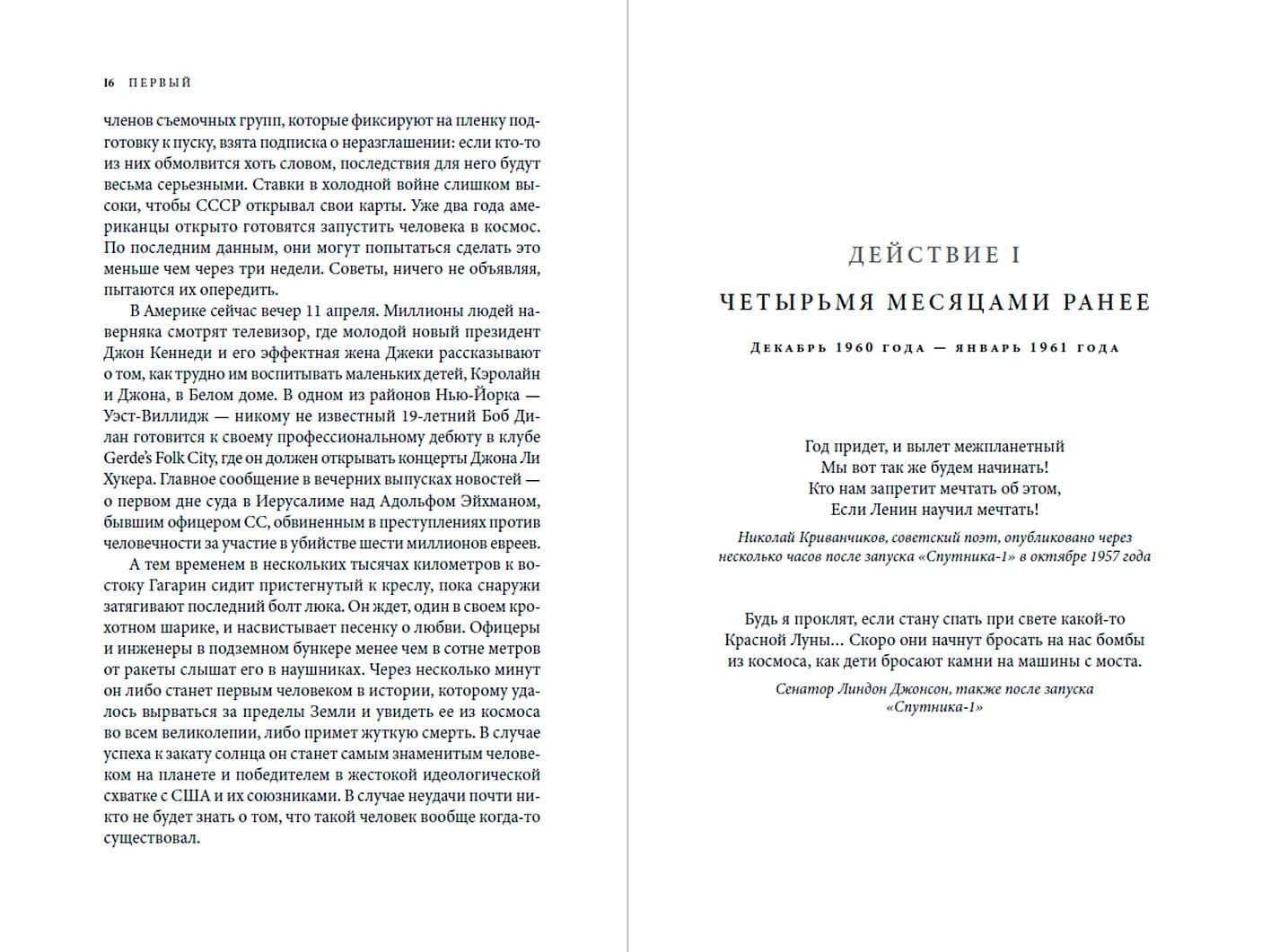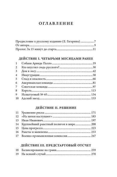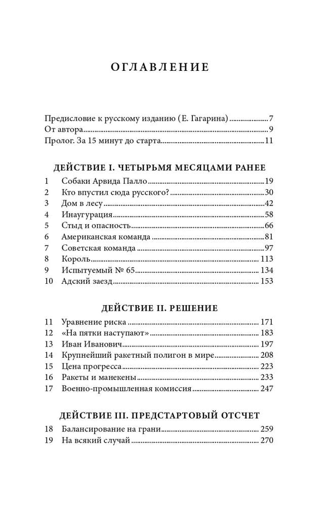 Автор проводит параллели между Сергеем Павловичем Королевым и Вернером фон Брауном, создателями ракет, а также Юрием Гагариным и Аланом Шепардом, двумя кандидатами на первый полет в космос. Центральное место в повествовании занимает история первого советского космонавта Юрия Гагарина.