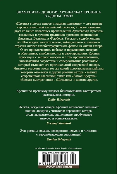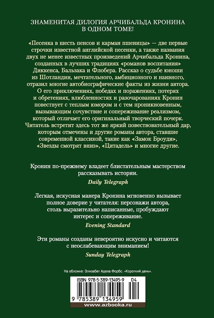 «Песенка в шесть пенсов и карман пшеницы» — две первые строчки известной английской песенки, а также названия не менее известных двух произведений Арчибальда Кронина, созданных в лучших традициях «романов воспитания» Диккенса, Бальзака и Флобера. Рассказ о судьбе юноши из Шотландии, мечтательного, амбициозного и наивного отразил многие автобиографические факты из жизни автора. О его приключениях, победах и поражениях, потерях и обретениях, влюбленностях и разочарованиях Кронин повествует с теплым юмором и с тем проникновенным, вызывающим сочувствие и сопереживание реализмом, который отличает его оригинальный творческий почерк.