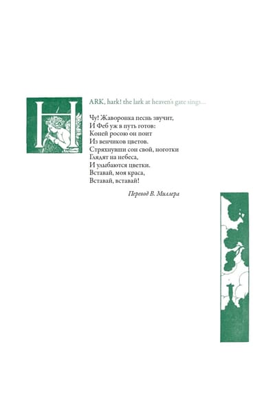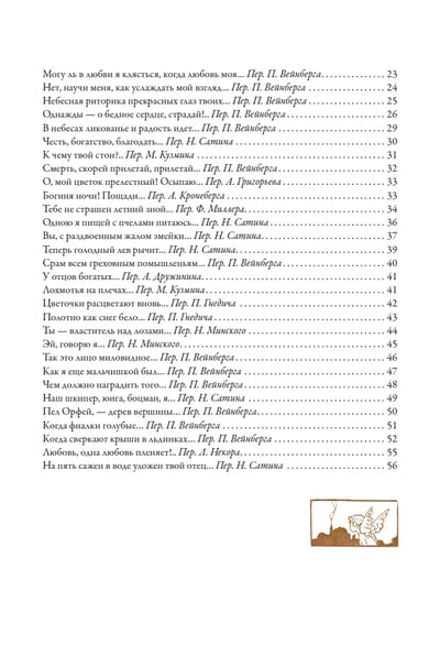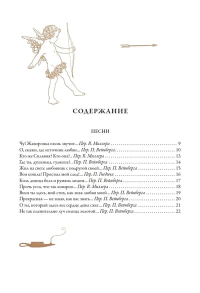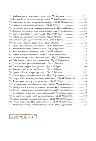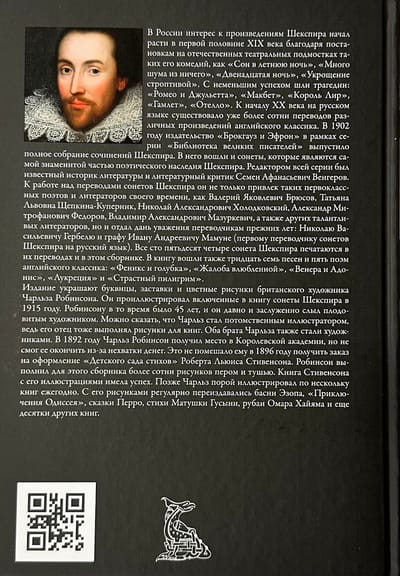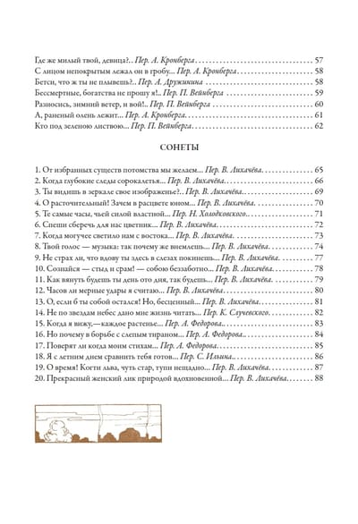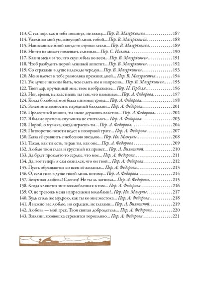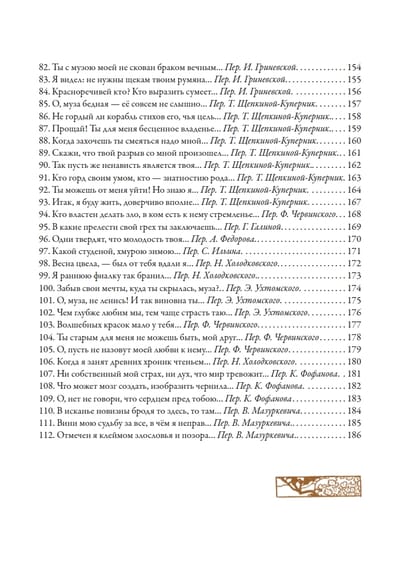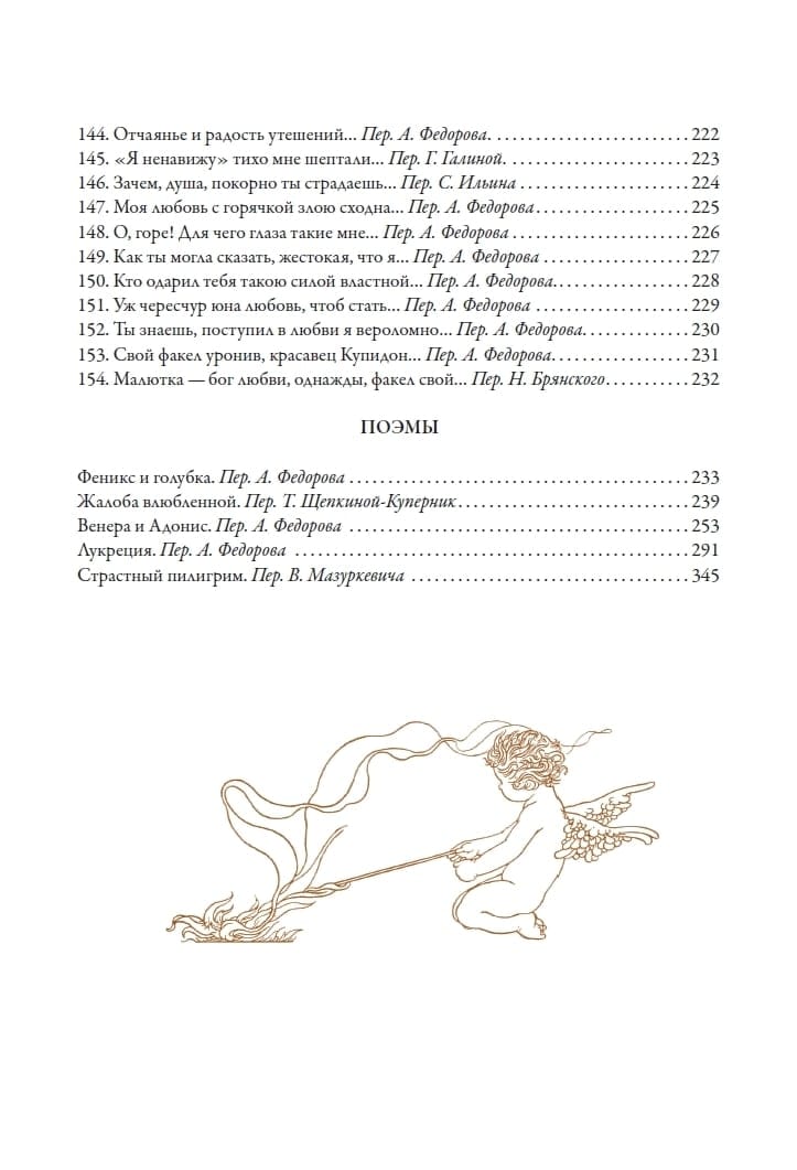 Сборник произведений Вильяма Шекспира (1564–1616) в переводах различных литераторов включает сто пятьдесят четыре сонета, тридцать семь песен, а также пять поэм: «Феникс и голубка», «Жалоба влюбленной», «Венера и Адонис», «Лукреция» и «Страстный пилигрим». Издание украшают буквицы, заставки и иллюстрации британского художника Чарльза Робинсона (1870–1937).