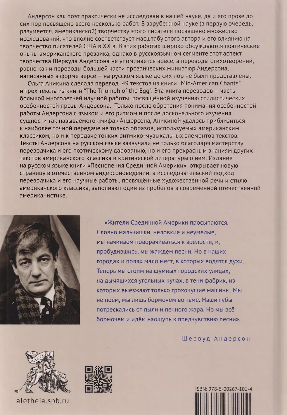 Ольга Аникина сделала перевод 49 текстов из книги «Mid-American Chants» и трех текстов из книги «The Triumph of the Egg». Эта книга переводов – часть большой многолетней научной работы, посвященной изучению стилистических особенностей прозы Андерсона. Только после обретения понимания особенностей работы Андерсона с языком и его ритмом и после досконального изучения сущности так называемого «мифа» Андерсона, О. Аникиной удалось приблизиться к наиболее точной передаче не только образов, используемых американским классиком, но и к передаче тонких ритмико-музыкальных элементов текстов. Издание на русском языке книги «Песнопения Срединной Америки» открывает новую страницу в отечественном андерсоноведении и заполняет один из пробелов в современной отечественной американистике.