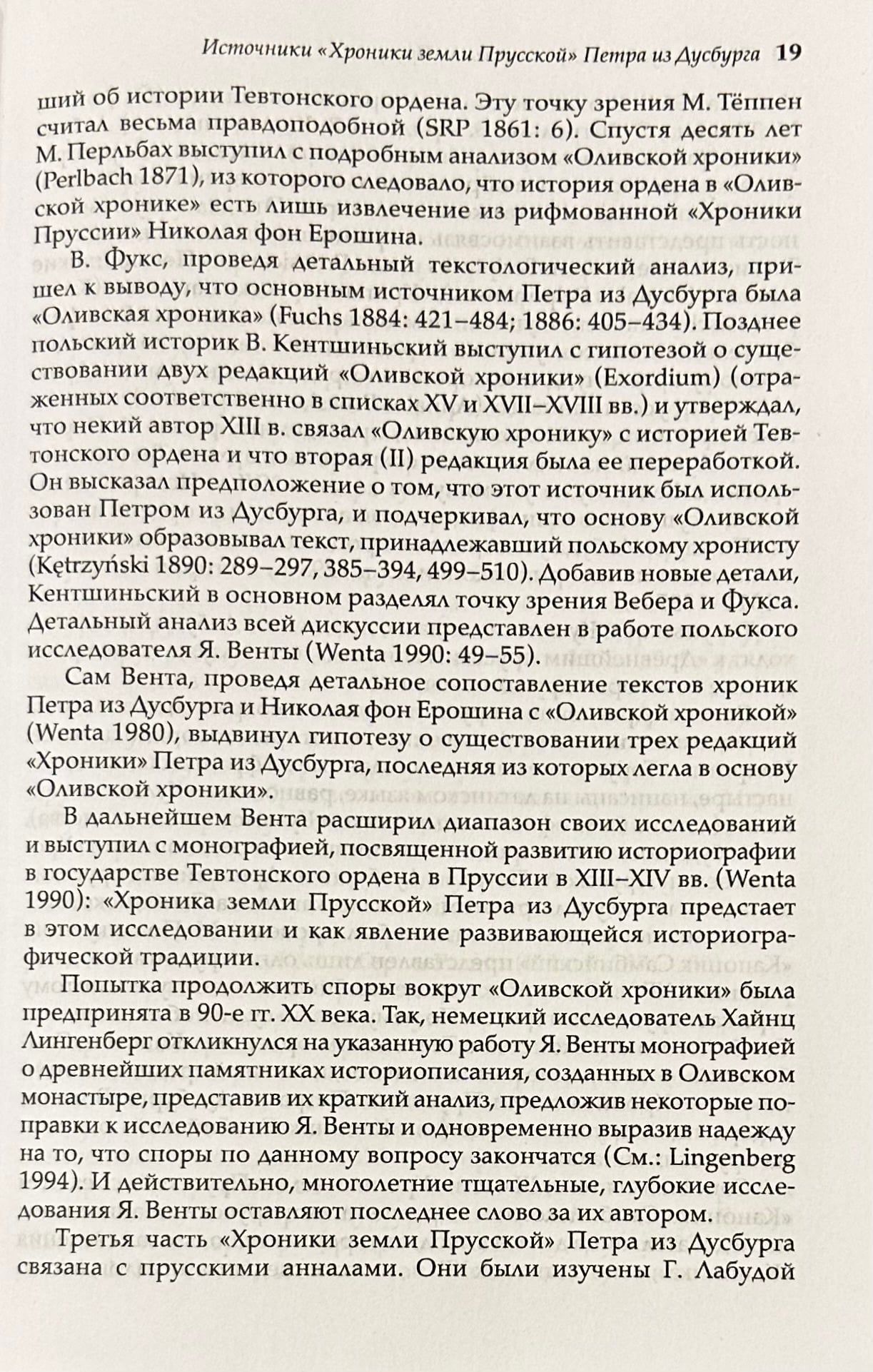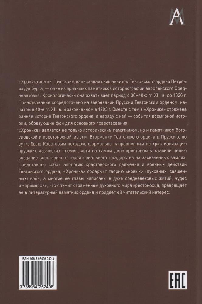 «Хроника земли Прусской», написанная священником Тевтонского ордена Петром из Дусбурга, — один из ярчайших памятников историографии европейского Средневековья. Хронологически она охватывает период с 30–40-х гг. XIII в. до 1326 г. Повествование сосредоточено на завоевании Пруссии Тевтонским орденом, начатом в 40-е гг. XIII в. и законченном в 1293 г. Вместе с тем в «Хронике» отражена ранняя история Тевтонского ордена, а наряду с ней — события всемирной истории, образующие фон для основного повествования.