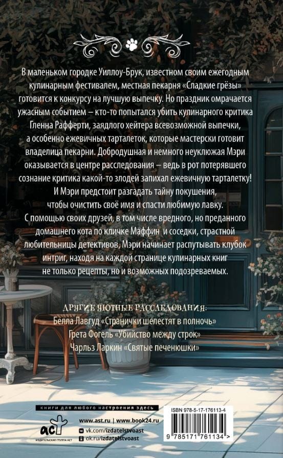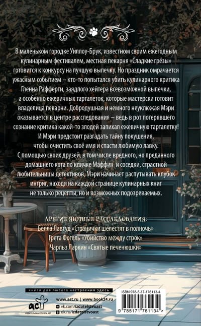 Добродушная и немного неуклюжая Мэри оказывается в центре расследования – ведь в рот потерявшего сознание критика какой-то злодей запихал ежевичную тарталетку! И Мэри предстоит разгадать тайну покушения, чтобы очистить своё имя и спасти любимую лавку. С помощью своих друзей, в том числе вредного, но преданного домашнего кота по кличке Маффин и соседки, страстной любительницы детективов, Мэри начинает распутывать клубок интриг, находя на каждой странице кулинарных книг не только рецепты, но и возможных подозреваемых.