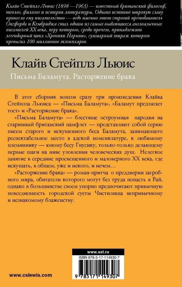 "Письма Баламута" – блестяще остроумная  пародия на старинный британский памфлет –  представляют собой серию писем старого и искушенного беса Баламута, занимающего респектабельное место в адской номенклатуре, к любимому племяннику  – юному бесу Гнусику, только-только делающему первые шаги на ниве уловления человеческих душ.  Нелегкое занятие в середине просвещенного и маловерного ХХ века, где искушать, в общем, уже и некого, и нечем… "Расторжение брака" – роман-притча  о преддверии загробного мира, обитатели которого могут без труда попасть в Рай, однако в большинстве своем упорно предпочитают привычную повседневность городской суеты Чистилища непривычному и незнакомому блаженству.