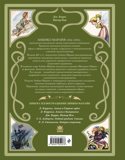 Необыкновенные иллюстрации к книге «Питер Пэн» создал известный итальянский художник Либико Марайя, Мастер Образа в классической книжной иллюстрации. Герои и сюжеты, вышедшие из-под его кисти, приобрели удивительную выразительность, уникальные черты и красочность, а иллюстрированную книгу сам художник называл не иначе, как театром, в разнообразии которого заключена сама жизнь.