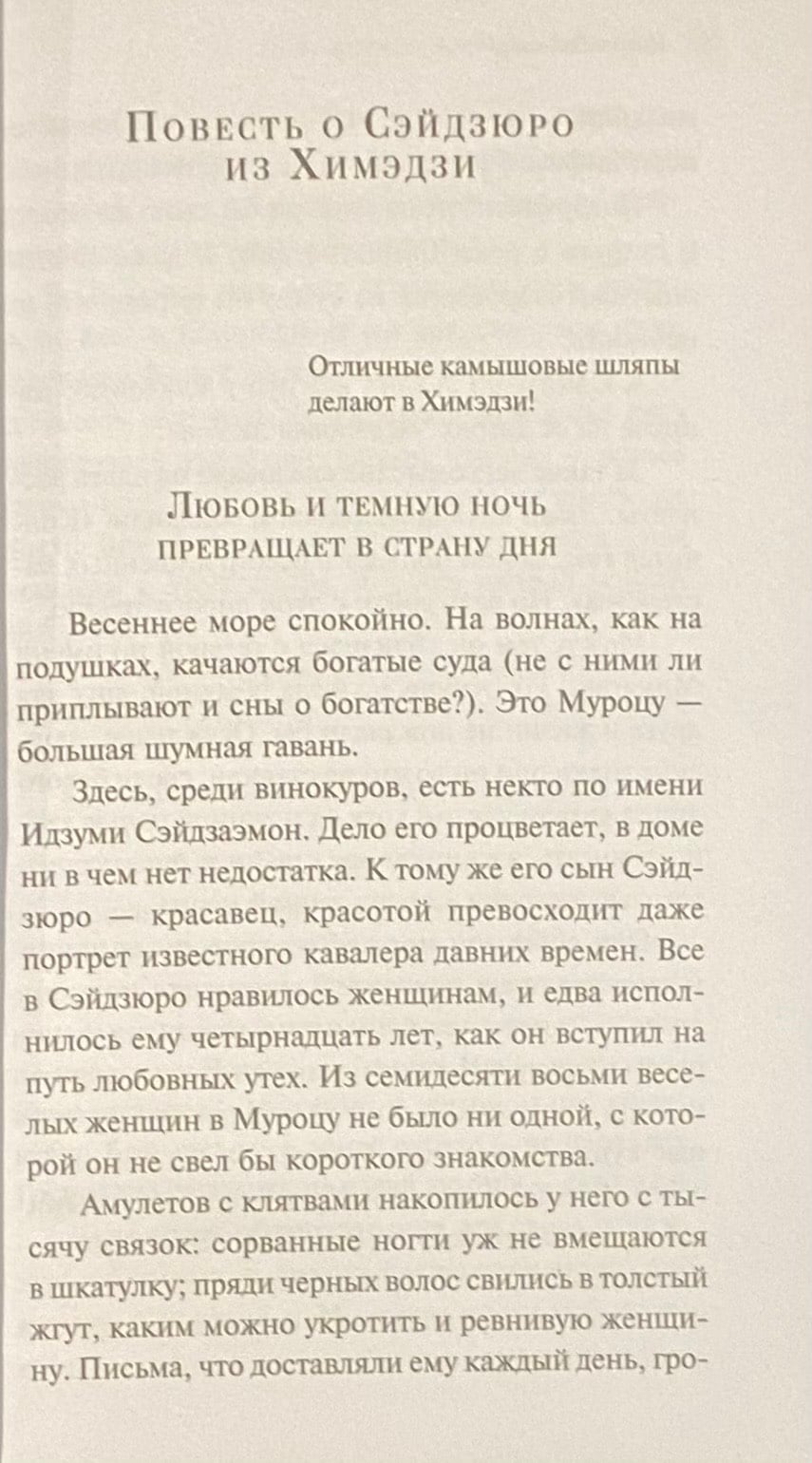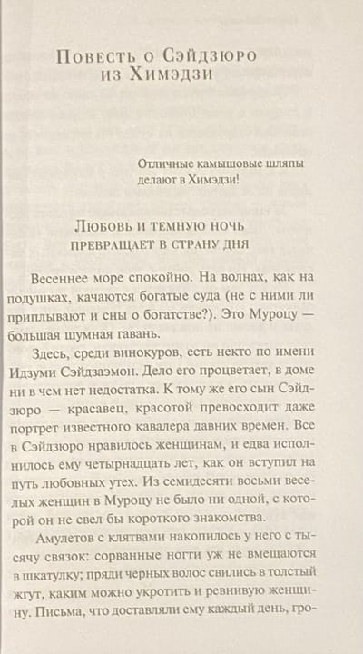 Японского поэта и прозаика Ихару Сайкаку еще при жизни признали классиком. За редкий талант импровизации его назвали «мастером двадцати тысяч строк». Стал родоначальником нового направления в прозе — укиё-дзоси (повести о бренном мире), но прославился косёку-моно (повести о любви). Сайкаку так ярко описал мир страсти и наслаждений и так полнокровно изобразил жизнь современной ему Японии со всем, что в ней есть низкого и высокого, что поднял жанр любовные новеллы до уровня настоящей литературы.