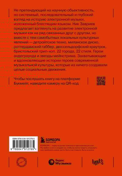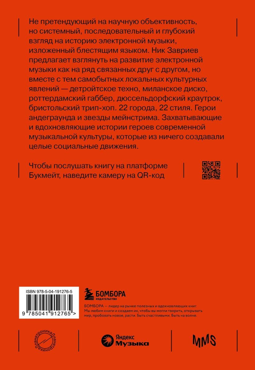 Ник Завриев предлагает взглянуть на развитие электронной музыки как на ряд связанных друг с другом, но вместе с тем самобытных локальных культурных явлений — детройтское техно, миланское диско, роттердамский габбер, дюссельдорфский краутрок, бристольский трип-хоп. 22 города, 22 стиля. Герои андеграунда и звезды мейнстрима. Захватывающие и вдохновляющие истории героев современной музыкальной культуры, которые из ничего создавали целые социальные движения.
