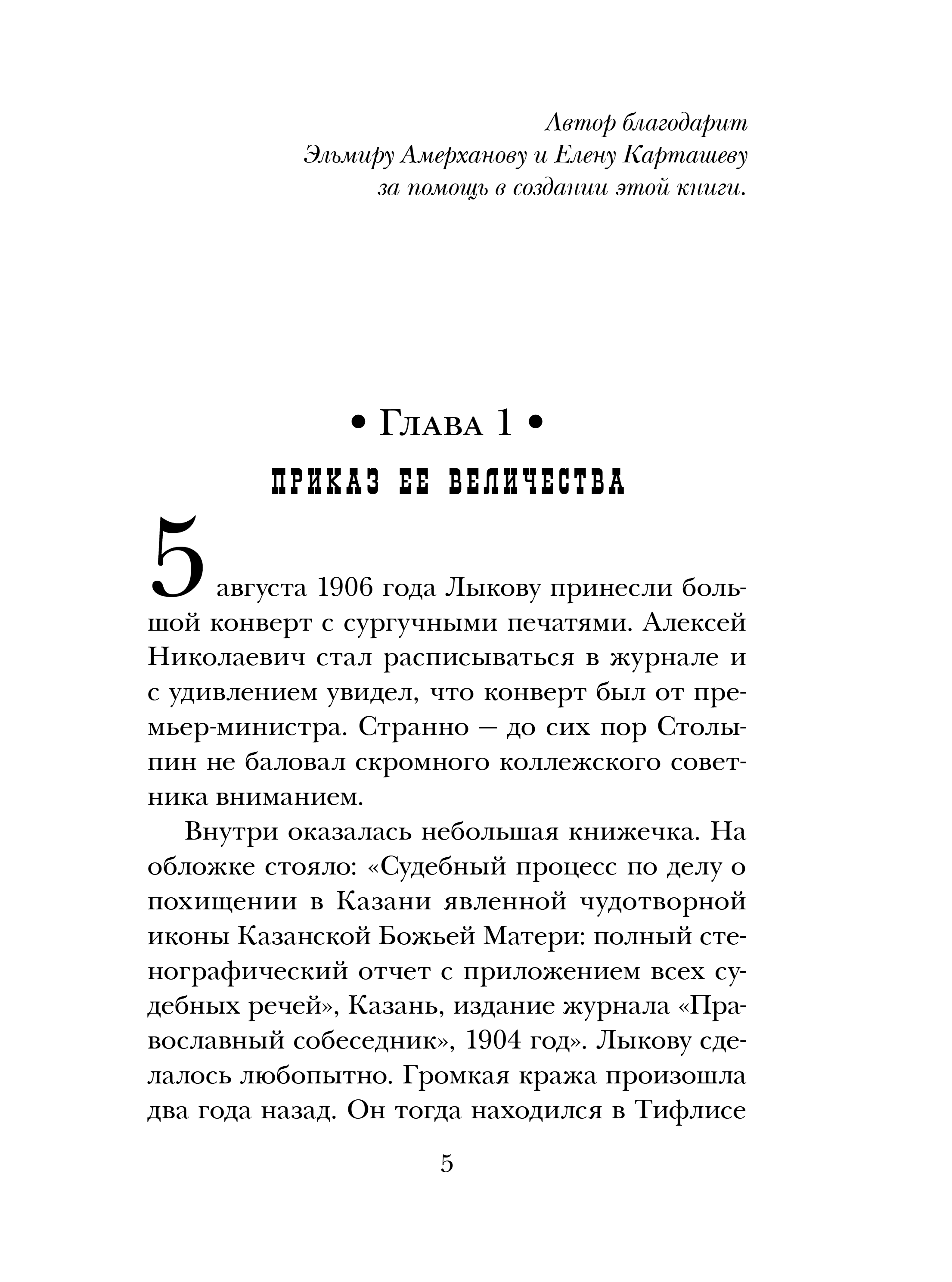 1906 год. Императрица Александра Федоровна поручила премьер-министру Столыпину необычное дело. Два года назад в женском монастыре в Казани была похищена чудотворная икона Казанской Божией Матери. Полиция нашла воров, но саму реликвию отыскать не сумела. В обществе упорно ходили слухи, что образ цел и где-то спрятан. Столыпин командировал лучшего сыщика Департамента полиции, коллежского советника Лыкова, на поиск иконы. Сыщик выехал в Казань. Но как только приступил к дознанию, в городе стали происходить страшные события.