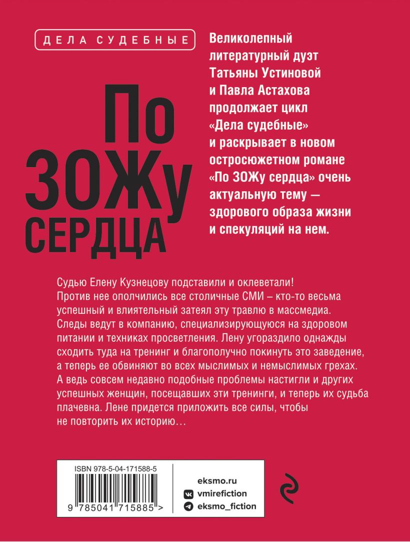 Детективный роман Татьяны Устиновой и Павла Астахова «По ЗОЖу сердца» – шестая книга обновленного цикла «Дела судебные». Главная героиня каждого романа – судья Елена Кузнецова, разрывающаяся между работой и личной жизнью. Ее отношения с Никитой Говоровым зашли в тупик, а дочь-подросток Саша помешалась на здоровом образе жизни и активно привлекает к нему мать. А Лена вовсе не против похудеть и помолодеть, она даже отправилась на тренинг компании, специализирующейся на здоровом образе жизни и духовном очищении. Ее пригласила туда бывшая однокурсница Полина — невзрачная студентка, каким-то чудом превратившаяся в ослепительную красотку с идеальной фигурой. Конечно, Лена захотела такого же волшебного результата! Но она забыла, что благими намерениями вымощена дорога в ад. После пробного занятия в ее жизни начались такие проблемы, о которых она раньше и помыслить не могла…
