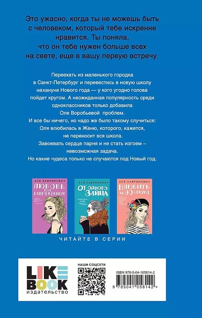 Переехать из маленького городка в Санкт-Петербург и перевестись в новую школу накануне Нового года — у кого угодно голова пойдет кругом. А неожиданная популярность среди одноклассников только добавила Оле Воробьевой проблем. И все бы ничего, но надо же было такому случиться: Оля влюбилась в Женю, которого, кажется, не переносит вся школа. Завоевать сердце парня и не стать изгоем — невозможная задача. Но какие чудеса только не случаются под Новый год. Ася Лавринович – молодой автор, получивший широкую известность благодаря публикации на Wattpad и Litnet.
