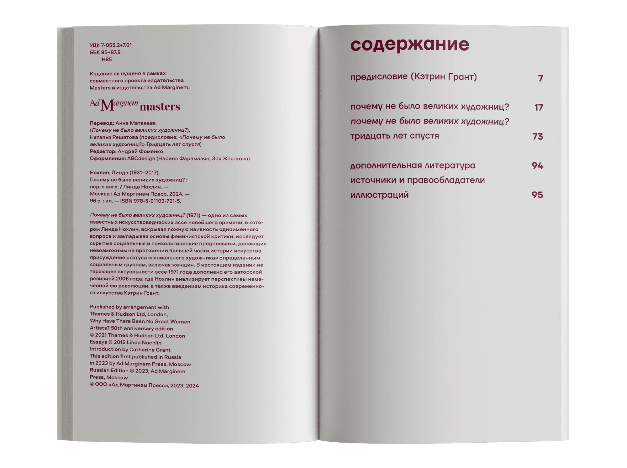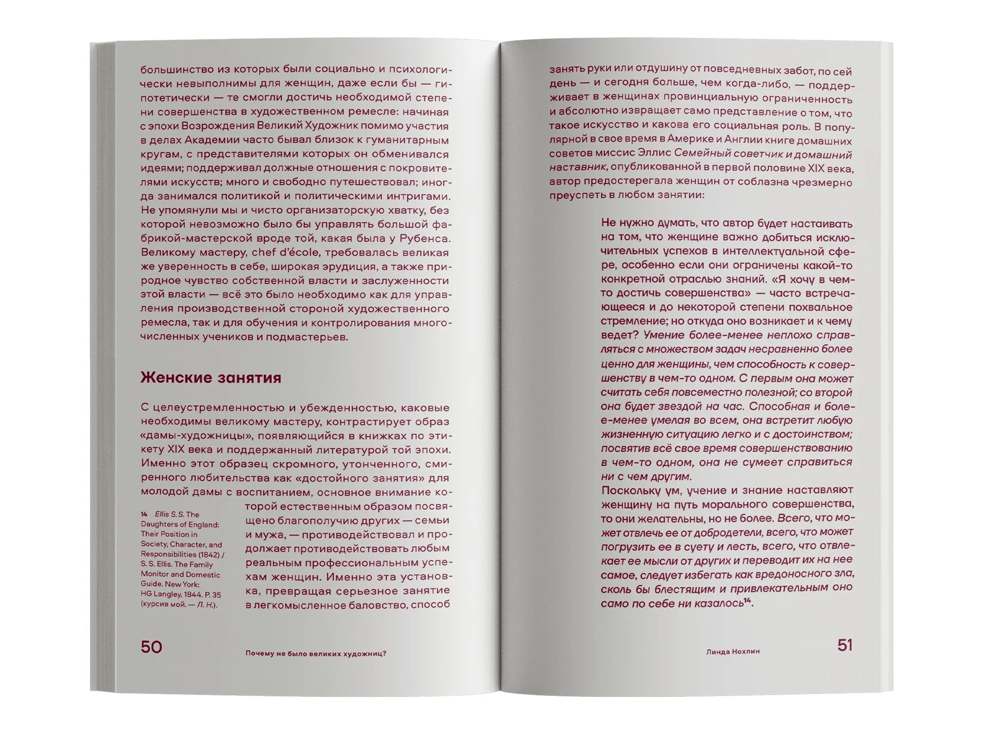 Почему не было великих художниц? (1971) — одно из самых известных искусствоведческих эссе новейшего времени, в котором Линда Нохлин, вскрывая ложную наивность одноименного вопроса и закладывая основы феминистской критики, исследует скрытые социальные и психологические предпосылки, делающие невозможным на протяжении большей части истории искусства присуждение статуса «гениального художника» определенным социальным группам, включая женщин. В настоящем издании не теряющее актуальности эссе 1971 года дополнено его авторской ревизией 2006 года, где Нохлин анализирует перспективы намеченной ею революции, а также введением историка современного искусства Кэтрин Грант.