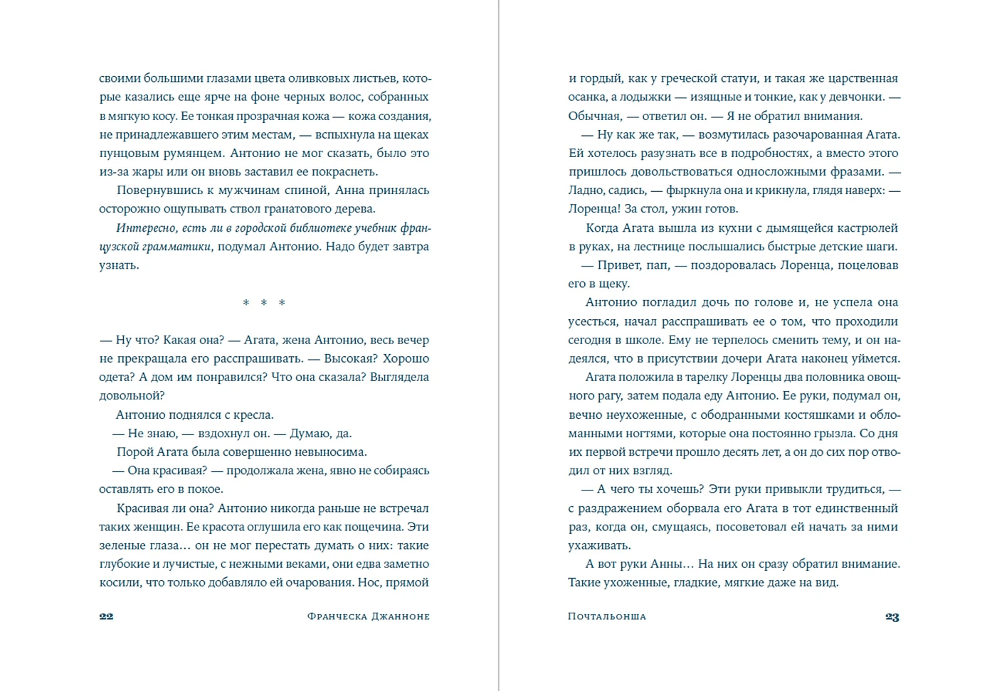 Действие романа Франчески Джанноне происходит на родине автора, Лиццанелло, в Саленто (Апулия, Италия), куда в июне 1934 года приезжает северянка Анна со своим мужем, южанином Карло, который очень рад вернуться в родные места, и маленьким сыном. Для местных Анна навсегда останется «иностранкой», угловатой своевольной гордячкой, острой на язык и не желающей следовать консервативным традициям Юга, этим вековым неписанным законам, сковывающим южных женщин. А для Антонио, старшего брата Карло, его жена, прекрасная, как античная статуя, станет любовью с первого взгляда. Год спустя, в 1935 году, Анна совершает нечто поистине революционное: она участвует в почтовом конкурсе, побеждает в нем и становится первым почтальоном Лиццанелло. Эта новость заставляет женщин воротить от нее носы и вызывает насмешки мужчин. «Это не продлится долго», — язвит кто-то. А вместо этого на протяжении более двадцати лет Анна станет невидимой нитью, объединяющей жителей страны. Сначала пешком, а потом на велосипеде она будет развозить письма солдат с фронта, открытки эмигрантов, послания тайных любовников. Сама того не желая – но, прежде всего, безо всякого на то желания общества – почтальонша Анна многое изменит в Лиццанелло.