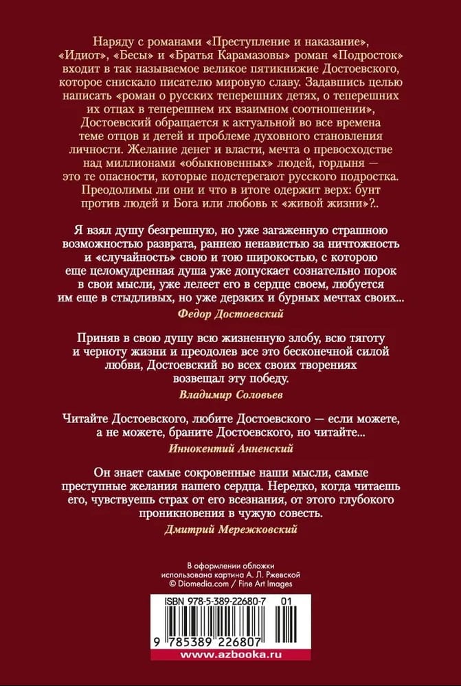 Наряду с романами «Преступление и наказание», «Идиот», «Бесы» и «Братья Карамазовы» роман «Подросток» входит в так называемое великое пятикнижие Достоевского, которое снискало писателю мировую славу. Задавшись целью написать роман «о русских теперешних детях, о теперешних их отцах в теперешнем их взаимном соотношении», Достоевский обращается к актуальной во все времена теме отцов и детей и проблеме духовного становления личности. Жажда денег и власти, мечта о превосходстве над миллионами «обыкновенных» людей, гордыня — это те опасности, которые подстерегают русского подростка. Преодолимы ли они и что в итоге одержит верх: бунт против людей и Бога или любовь к «живой жизни»?..