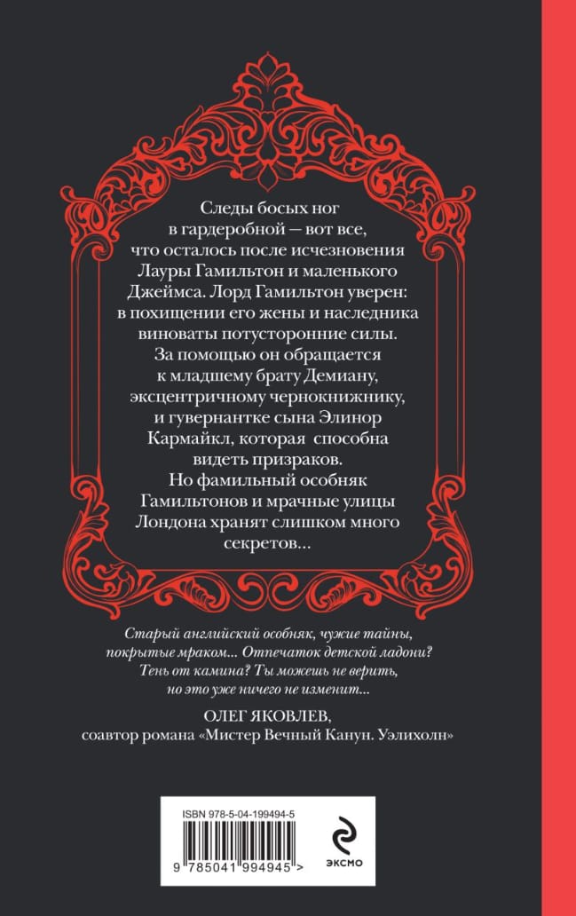 Следы босых ног в гардеробной — вот всё, что осталось после исчезновения Лауры Гамильтон и маленького Джеймса. Лорд Гамильтон уверен: в похищении его жены и наследника виноваты потусторонние силы. За помощью он обращается к младшему брату Демиану, эксцентричному чернокнижнику, и гувернантке сына Элинор Кармайкл, которая способна видеть призраков. Но фамильный особняк Гамильтонов и мрачные улицы Лондона хранят слишком много секретов…