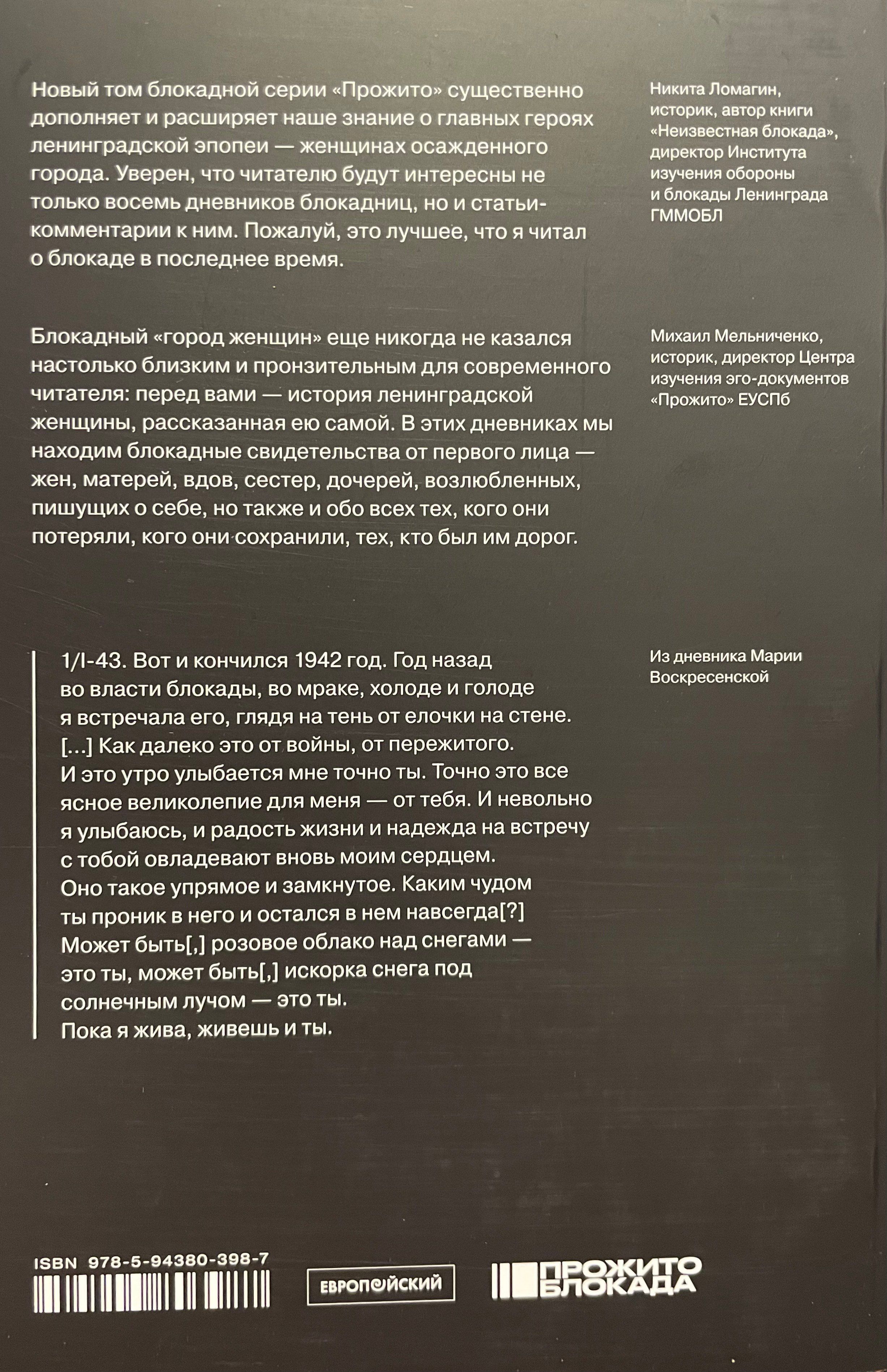 Блокадный Ленинград был «городом женщин» - их трагический опыт послужил основой пронзительного и уникального по своему содержанию дневникового письма от первого лица. Настоящее издание продолжает серию публикаций дневников жителей блокадного Ленинграда, начатую Центром изучения эго-документов «Прожито» ЕУСПб в 2022 году. В новом томе составители обращаются к особому феномену женского дневника и блокадной женственности. В 1941-1944 годах в блокадном Ленинграде менялись представления о социальных ролях в условиях войны и «смертного времени». Это книга о женщинах, которые в эпоху катастрофы вынесли на себе всё. Перед вами восемь дневников ленинградок. Каждый из них говорит нам о совершенно разном опыте блокады. Геолог и поэт М. Н. Воскресенская, преподаватель М. Н. Воробьева, домохозяйка Л. Д. Борель, военная медсестра А. В. Бритвина, директор детского дома Н. Г. Горбунова, партработница В. М. Капитонова, школьница М. С. Розa (Каретникова), студентка и дружинница З. Е. Кондратьева… В их свидетельствах - жен и матерей, дочерей и сестер, возлюбленных и вдов - мы читаем ненаписанную историю ленинградской женщины, историю, сотканную из печалей и страхов, повседневных тягот и битвы за выживание, страданий и борьбы, оплакивания утрат и - в огромной степени - надежды и любви.
