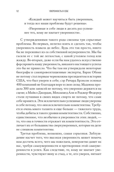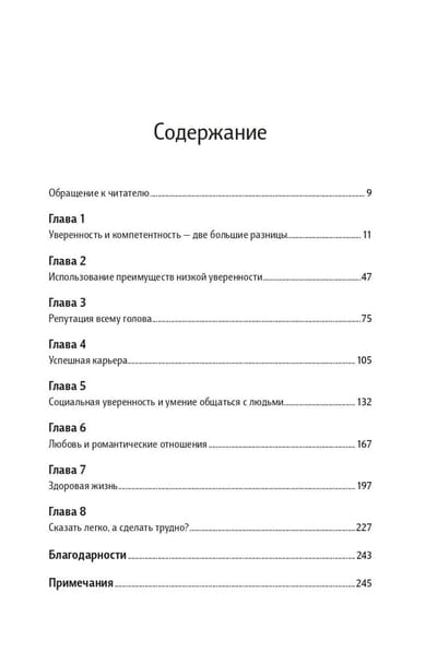 Автор убедительно разоблачает заносчивую самоуверенность, которую общество пытается навязать в качестве эталона, и последовательно истолковывает все сомнения своих менее уверенных в себе читателей в их пользу. А как иначе, если столь ценимая большинством высокая самооценка способна заметно испортить жизнь, загубить здоровье и заставить всех тебя ненавидеть? В реальности именно неуверенность позволяет признать наши несовершенства, а значит, подталкивает к переменам, улучшению жизни и повышению компетентности — и в конечном счете приводит нас к успеху.