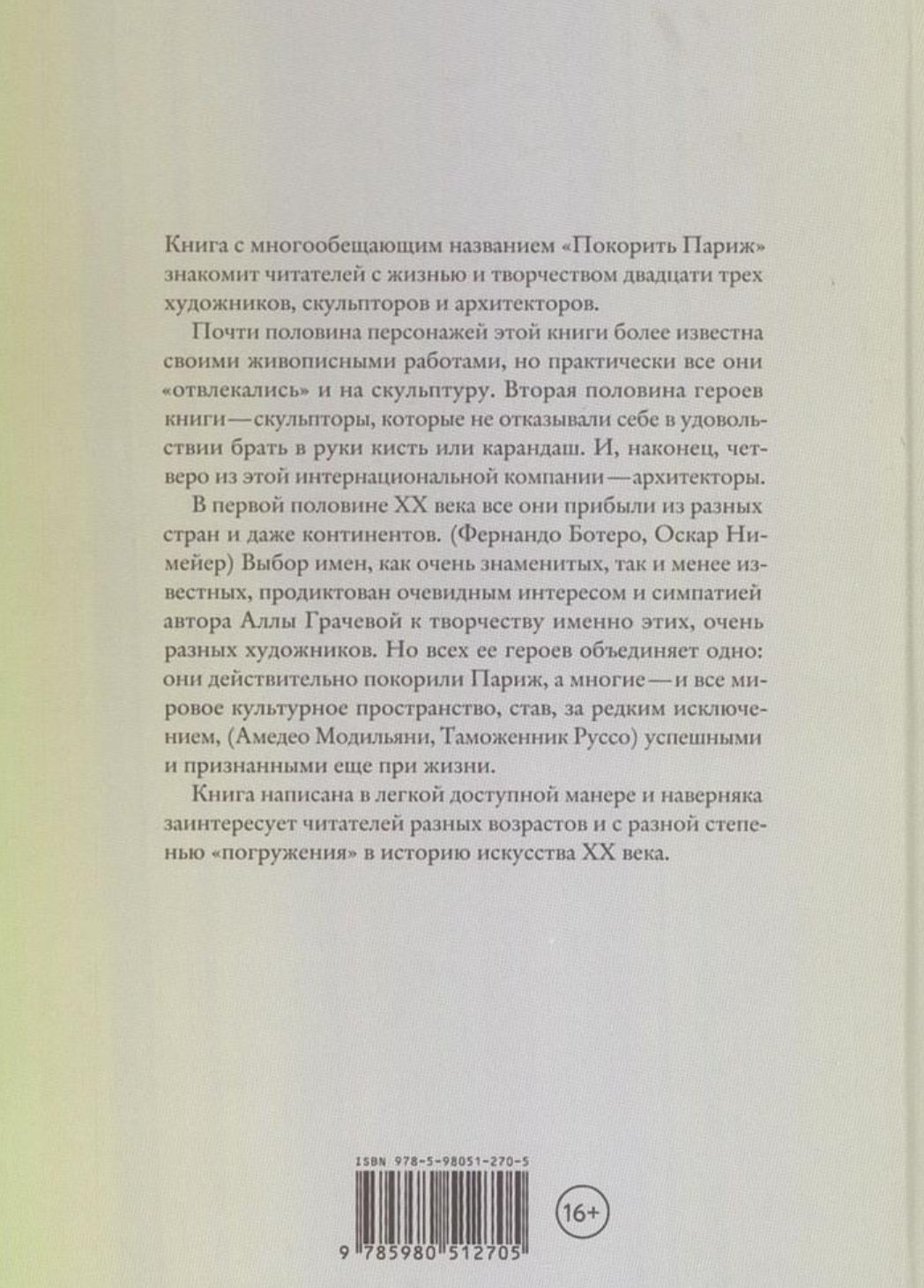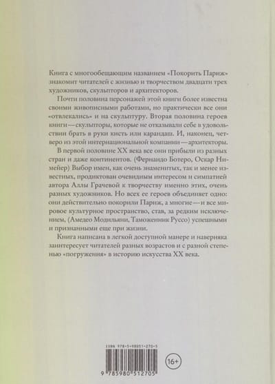 Книга Аллы Грачевой рассказывает о жизни и творчестве двадцати трех художников, скульпторов и архитекторов. Все они прибыли покорять Париж в первой половине ХХ века. Выбор имен как очень знаменитых, так и менее известных, продиктован очевидным интересом и симпатией автора к творчеству именно этих очень разных художников. Но всех ее героев объединяет одно: они действительно покорили Париж, а многие — и все мировое культурное пространство, став, за редким исключением (Амедео Модильяни, Таможенник Руссо), успешными и признанными при жизни.