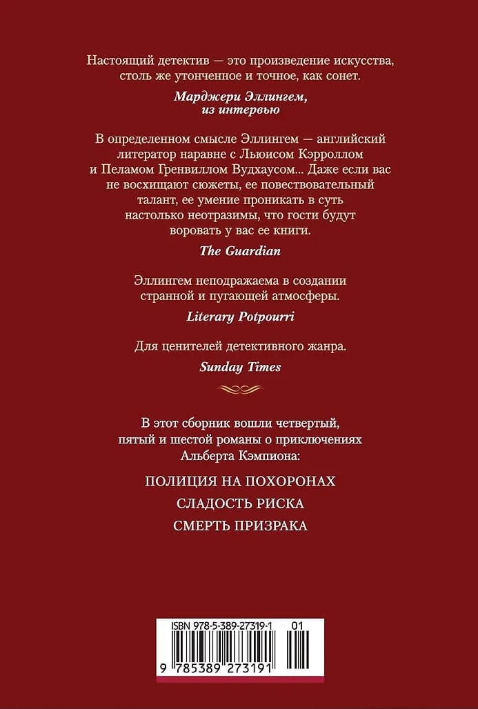 Марджери Луиза Эллингем — английская писательница, принадлежащая «золотому веку английской литературы», признанная «королева детектива» наряду с Агатой Кристи, Дороти Сэйерс и Найо Марш. Наибольшую известность приобрели книги Эллингем о сыщике-джентльмене Альберте Кэмпионе. В этот том вошли четвертый, пятый и шестой романы ее главного цикла.