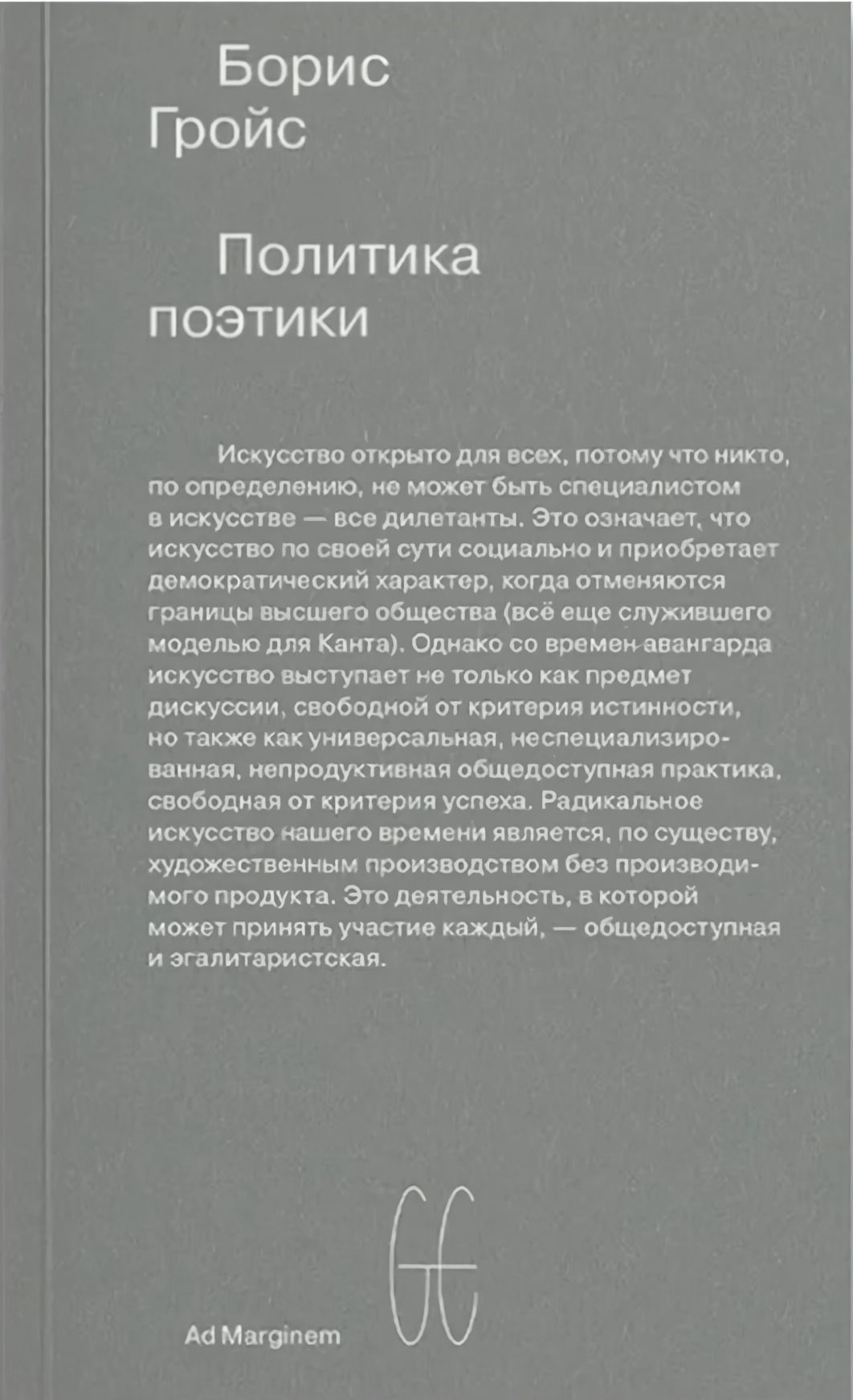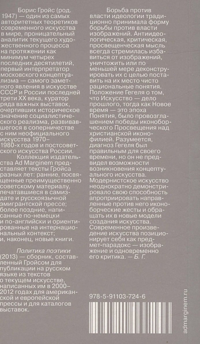 Политика поэтики (2013) — сборник, составленный Гройсом для публикации на русском языке из текстов о текущем искусстве, написанных им в 2000–2012 годах для американской и европейской прессы и для каталогов выставок.