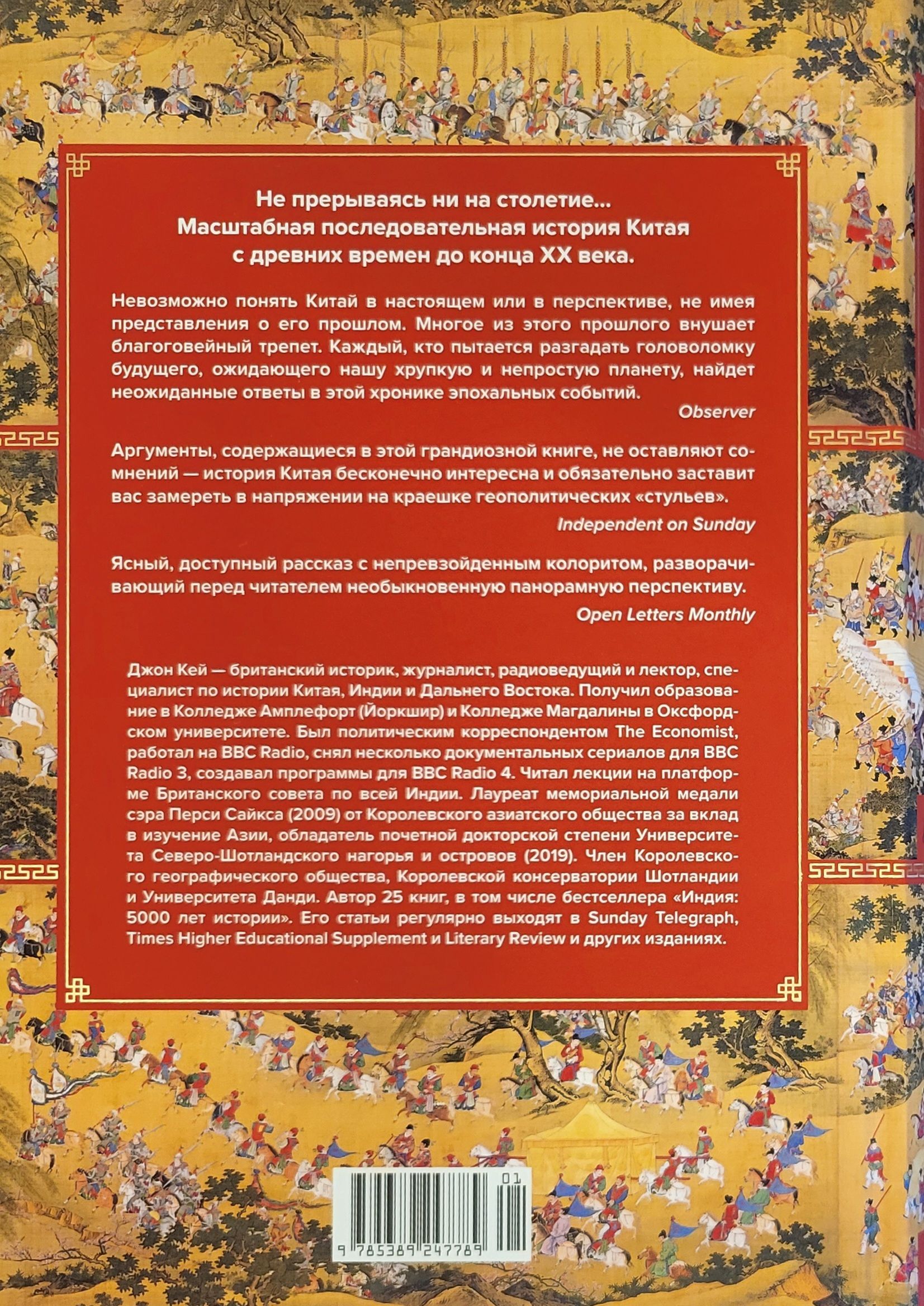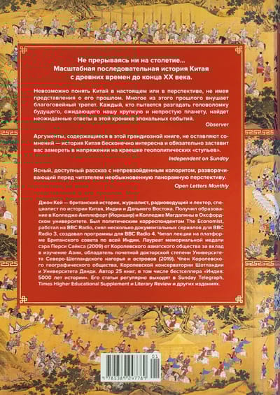 От дописьменного периода до конца XX столетия — видный британский историк Джон Кей представляет масштабную последовательную историю Китая. Созданная на богатом материале архивных источников, в том числе неопубликованных, эта книга уже признана классикой во всем мире. В подробном введении дается представление о географии Китая, хронологии его истории и особенностях языка, топонимов и имен собственных. В следующих разделах вы узнаете все самое главное о легендарных Пяти императорах, о мифическом царстве Ся и доимперских государствах Шан и Чжоу, об археологических находках, относящихся к бронзовому и железному векам, о периоде Сражающихся царств; о влиянии Конфуция, об объединении Китая Первым императором Цинь Ши-хуанди, о Культурной революции Цинь, возвышении и упадке Хань; о правлении династий Суй, Тан и Сун, об эпохе Пяти империй и Десяти государств, о триумфе и падении Мин. Освещены темы маньчжурского завоевания, ситуации в Джунгарии, Синьцзяне и Тибете, кризис Цин, ход Опиумных войн и восстание тайпинов; боксерское восстание, переход страны от империи к республике, события Русско-японской, Первой и Второй мировых войн и Культурной революции Мао Цзэдуна. Снабженное солидным справочным аппаратом, цветными вклейками, картами и таблицами, издание будет интересно широкому кругу читателей. «Эта книга предназначена для удовлетворения насущной потребности — представить читателю обзор истории Китая, для понимания которого не требуется предварительное знакомство с темой или знание китайского языка… История Китая достаточно длинна, а культура достаточно сложна. Искренне надеюсь, что в итоге усилия читателей будут вознаграждены сполна». (Джон Кей)