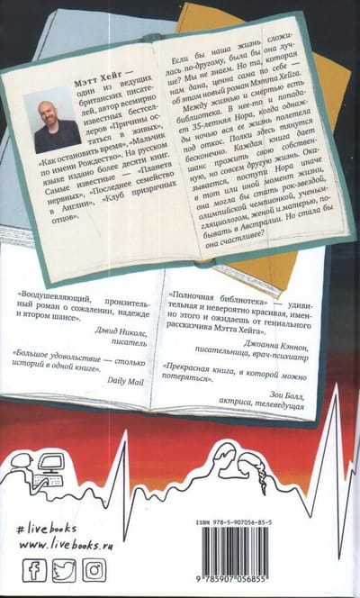 Если бы наша жизнь сложилась по-другому, была бы она лучше? Мы не знаем. Но та, которая нам дана, — ценна сама по себе, об этом новый роман Мэтта Хейга. Между жизнь и смертью есть библиотека. В неё попадает 35-летняя Нора, учительница музыки из Бедфорда, когда однажды ночью вся её жизнь летит под откос. Полки здесь тянутся бесконечно. Каждая книга даёт шанс прожить свою собственную, но совсем другую жизнь. Принимать другие решения и, главное, не сожалеть о том, что когда-то не случилось. Оказывается, поступи Нора иначе в тот или иной момент жизни, она могла бы стать рок-звездой, олимпийской чемпионкой, учёным-гляциологом, женой и матерью, побывать в Австралии. Но стала бы она счастливее?