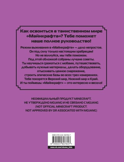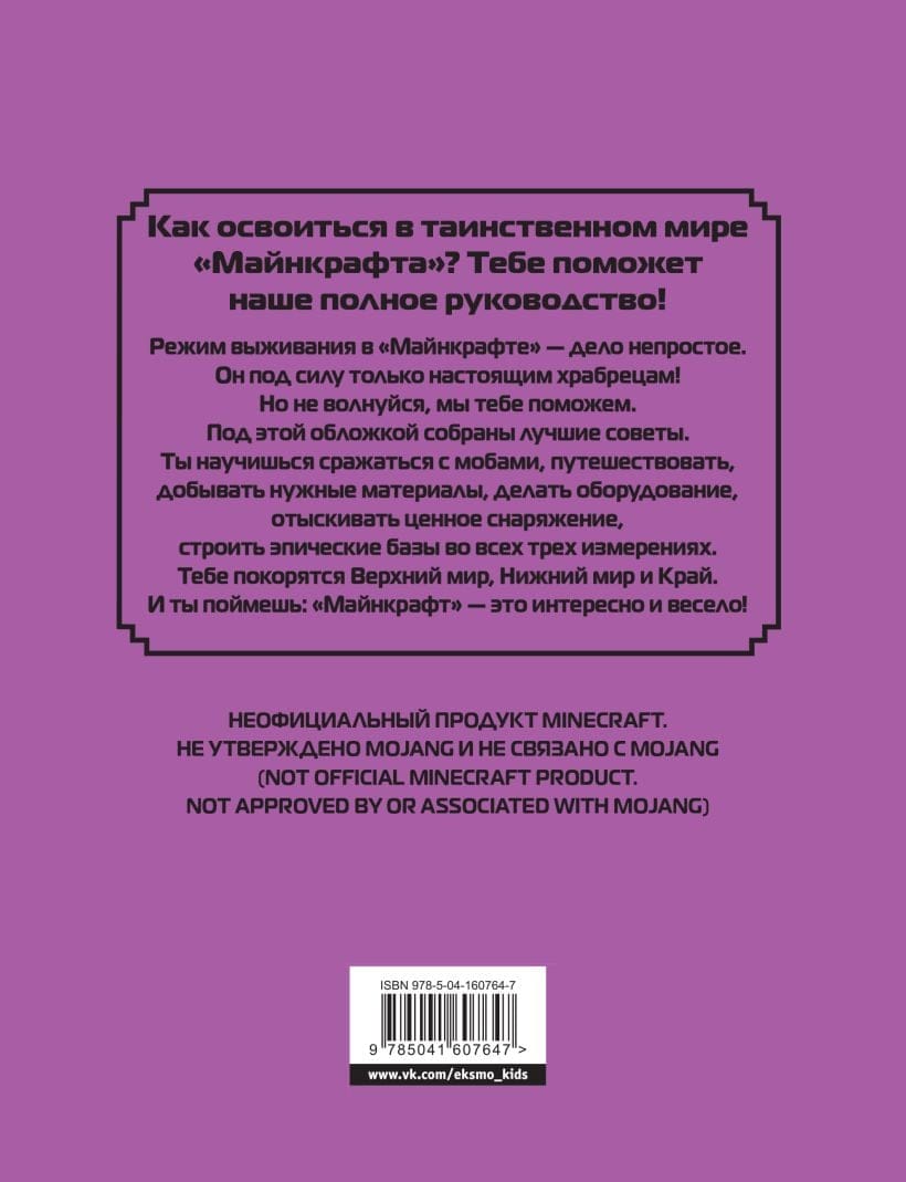 Режим выживания в «Майнкрафте» — дело непростое. Он под силу только настоящим храбрецам! Но не волнуйся, мы тебе поможем. Под этой обложкой собраны лучшие советы. Ты научишься сражаться с мобами, путешествовать, добывать нужные материалы, делать оборудование, отыскивать ценное снаряжение, строить эпические базы во всех трех измерениях. Тебе покорятся Верхний мир, Нижний мир и Край. И ты поймешь: «Майнкрафт» — это интересно и весело!