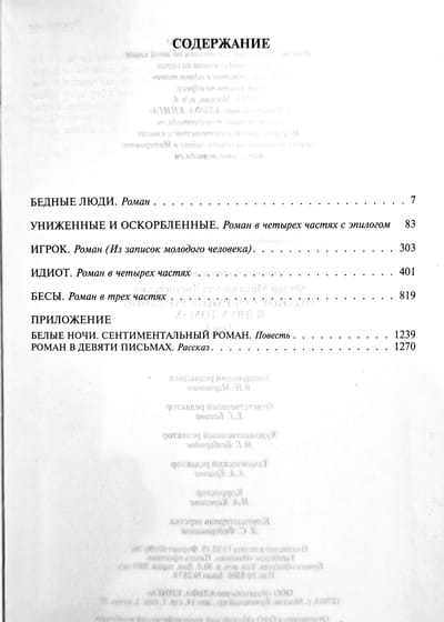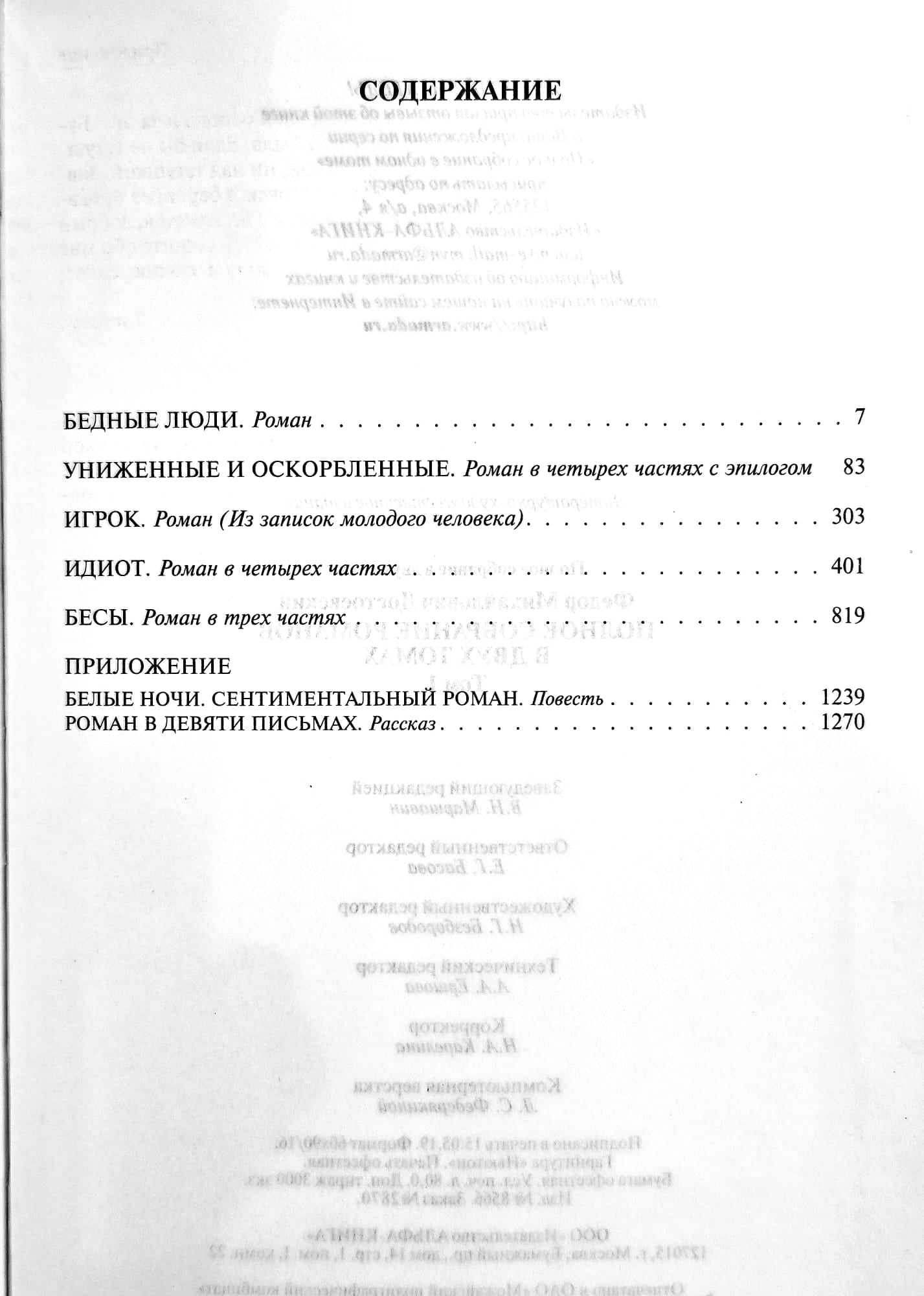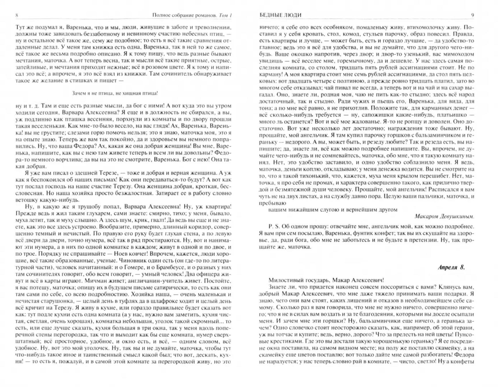 В первый том вошли романы «Бедные люди», «Игрок», «Идиот», «Бесы», «Униженные и оскорбленные», а в Приложении - «Рассказ роман в девяти письмах» и повесть «Белые ночи. Сентиментальный роман».
