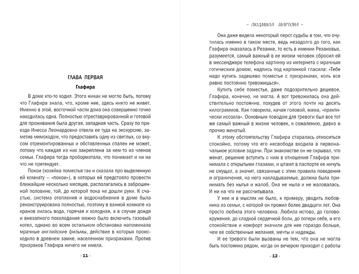 Писательница Глафира Северцева, главная героиня нового романа Людмилы Мартовой «Поместье с привидениями», оказывается втянута в странные события.Когда Глафира собиралась поработать над новой книгой на природе, она и представить себе не могла, что окажется на месте преступления. После семейного торжества найдена убитой Инесса Резанова, хозяйка поместья, у которой гостила Глафира. К тому же пропали очень ценные вещи. Неужели убийца — кто-то из наследников? Или тайны прошлого дождались своего часа? И что за привидение прячется на чердаке дома? Чтобы не погибнуть самой, Глафире придется помочь Глебу Ермолаеву. А может, это ее судьба…