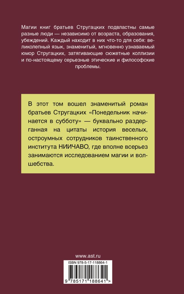 В этот том вошел знаменитый роман братьев Стругацких "Понедельник начинается в субботу" — буквально раздерганная на цитаты история веселых, остроумных сотрудников таинственного института НИИЧАВО, где вполне всерьез занимаются исследованием магии и волшебства.