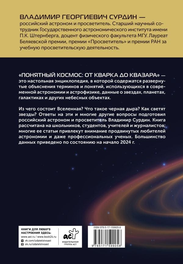 «Понятный космос: от кварка до квазара» — это настольная энциклопедия, в которой содержатся развернутые объяснения терминов и понятий, использующихся в современной астрономии и астрофизике, данные о звездах, планетах, галактиках и других небесных объектах. Из чего состоит Вселенная? Что такое черная дыра? Как светят звезды? Ответы на эти и многие другие вопросы подготовил российский астроном и просветитель Владимир Сурдин. Книга рассчитана на школьников, студентов, учителей и журналистов; многие ее статьи привлекут внимание продвинутых любителей астрономии и даже профессиональных ученых. Большинство данных приведено по состоянию на начало 2023 г.