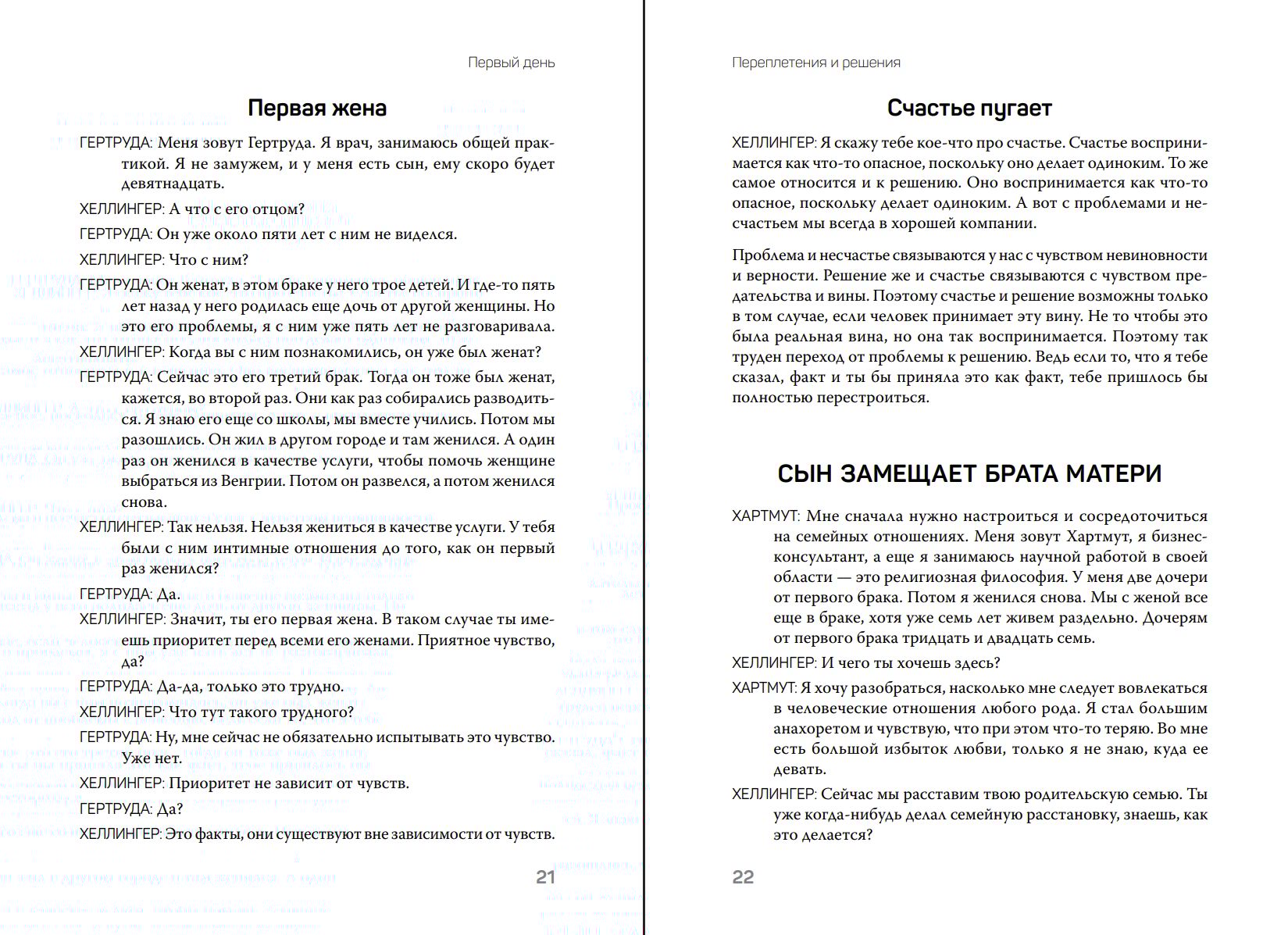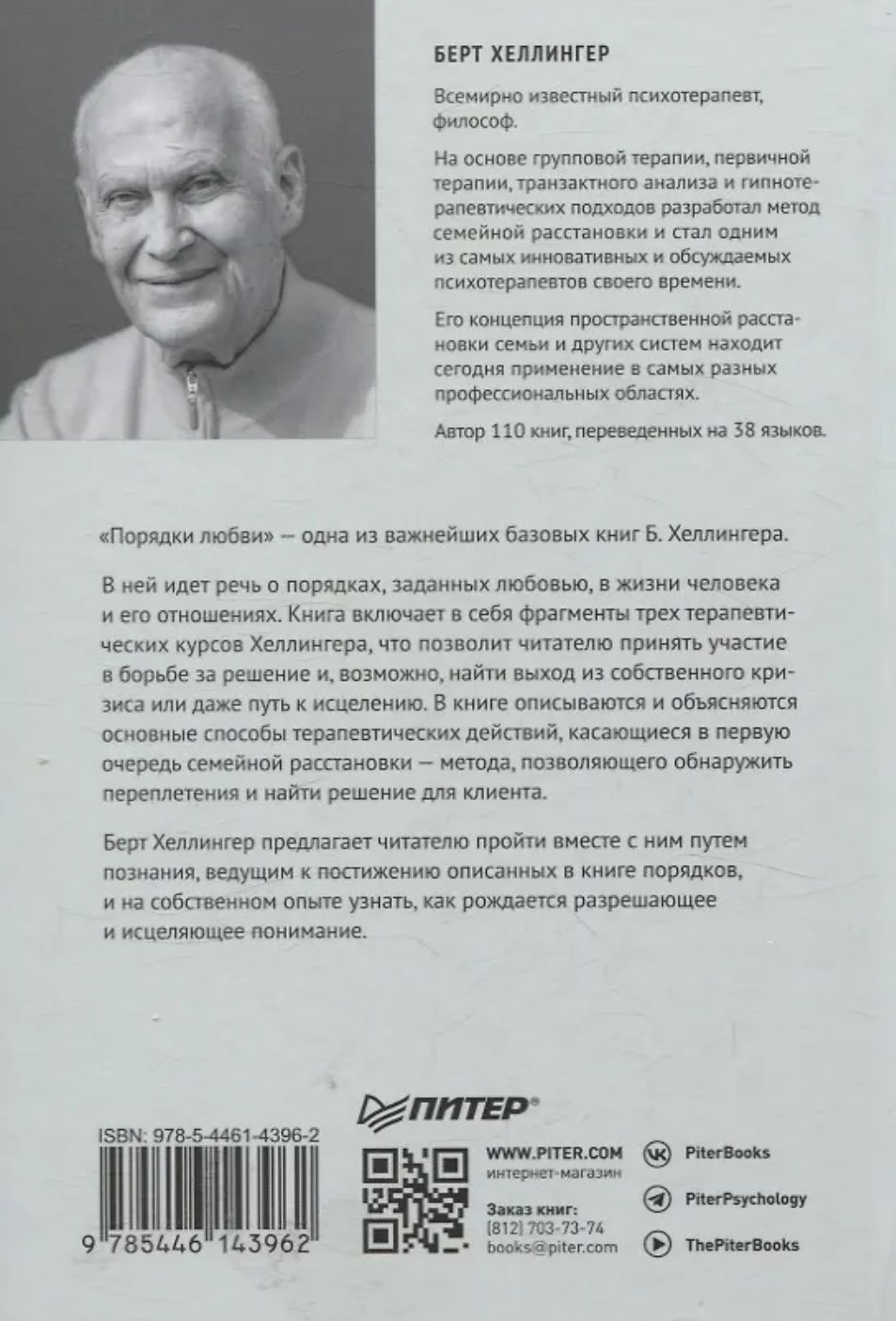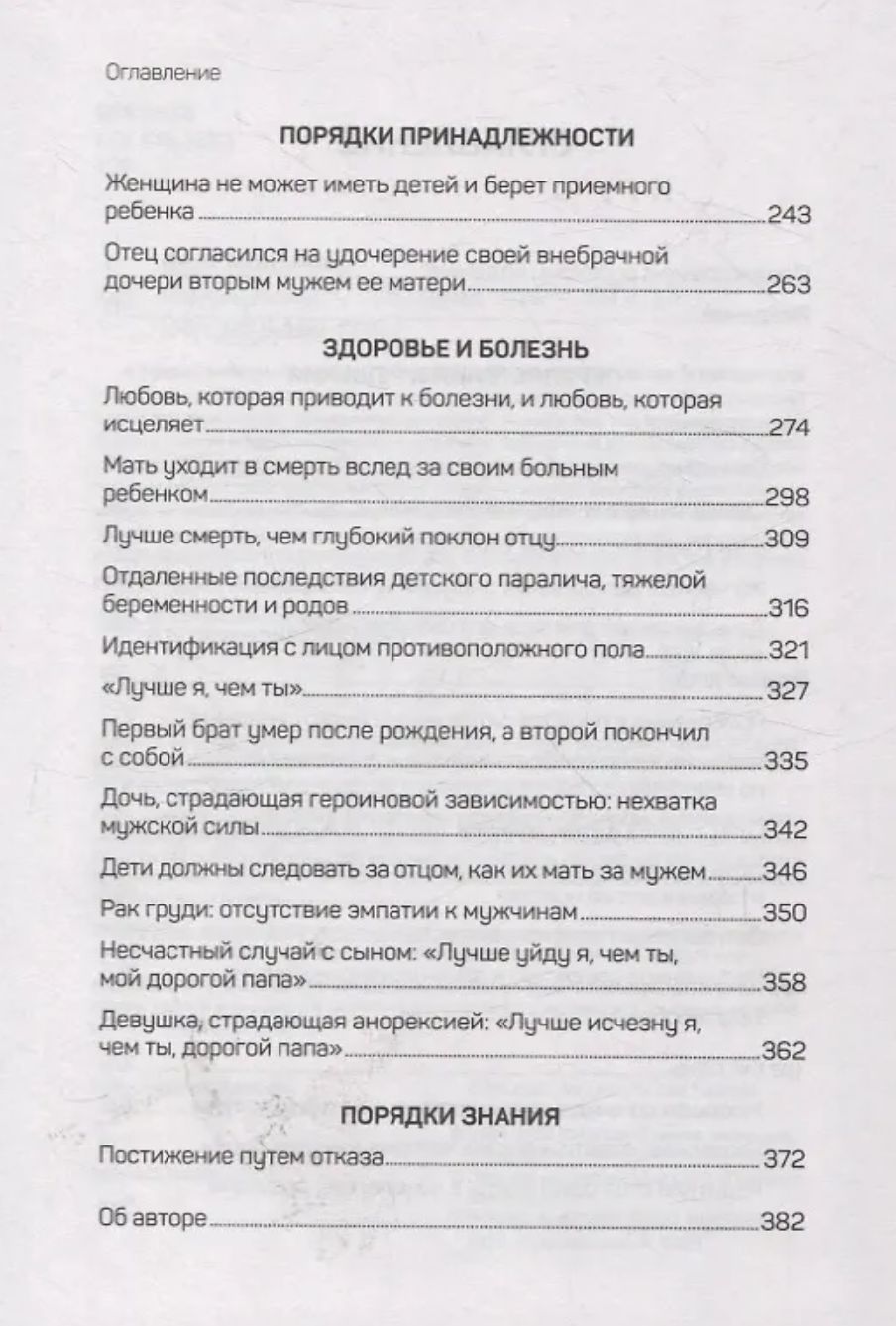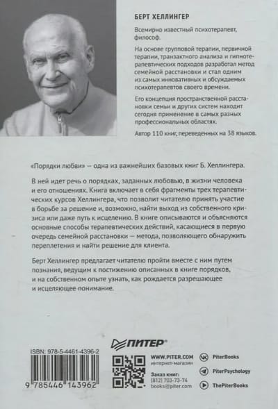«Порядки любви» – одна из важнейших базовых книг Б. Хеллингера. В ней идет речь о порядках, заданных любовью, в жизни человека и его отношениях. Книга включает в себя фрагменты трех терапевтических курсов Хеллингера, что позволит читателю принять участие в борьбе за решение и, возможно, найти выход из собственного кризиса или даже путь к исцелению. В книге описываются и объясняются основные способы терапевтических действий, касающиеся в первую очередь семейной расстановки – метода, позволяющего обнаружить переплетения и найти решение для клиента. Берт Хеллингер предлагает читателю пройти вместе с ним путем познания, ведущим к постижению описанных в книге порядков, и на собственном опыте узнать, как рождается разрешающее и исцеляющее понимание.