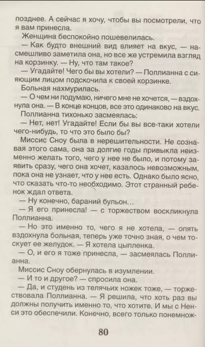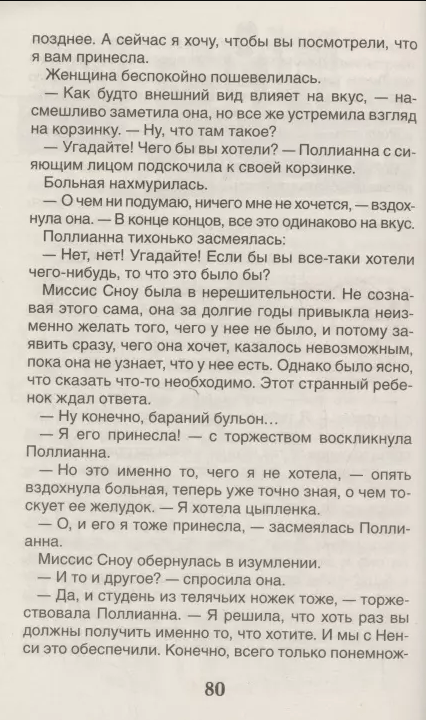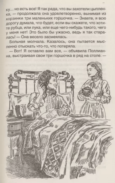 Роман американской писательницы Элинор Портер, написанный в 1913 году, мгновенно обрел широкую известность и до сих пор очень популярен. Читателей с первых страниц захватывает и увлекает судьба бедной сироты Поллианны, которая переезжает жить в дом своей суровой тети Полли. Что бы с ней ни происходило, девочка во всем пытается найти что-то хорошее и радостное. Ее живость и непосредственность удивляют и смешат жителей городка, а доброта, доверчивость и готовность прийти на помощь способны растопить любое сердце – и старого холостяка, и сварливой, вечно всем недовольной больной миссис Cноу, и замкнувшейся в холодном одиночестве тети Полли. Когда с Поллианной случается несчастье, весь город спешит ее поддержать, вернуть ей радость жизни. Забота окружающих и страстное желание самой девочки всех радовать совершают чудо и поднимают ее на ноги.