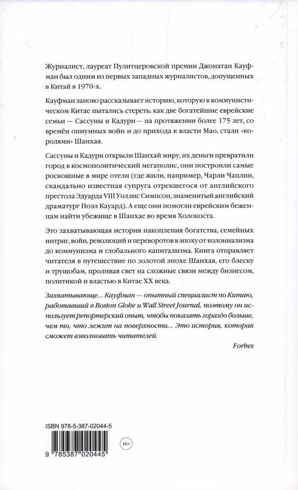 Журналист, лауреат Пулицеровской премии Джонатан Кауфман был одним из первых западных журналистов, допущенных в Китай в 1970-х. Кауфман открывает историю, которую официальный коммунистический Китай пытался стереть: как две богатейшие еврейские семьи — Сассун и Кадури — на протяжении более 175 лет, с опиумных войн и до прихода к власти Мао и компартии, управляли экономикой и политикой Шанхая.