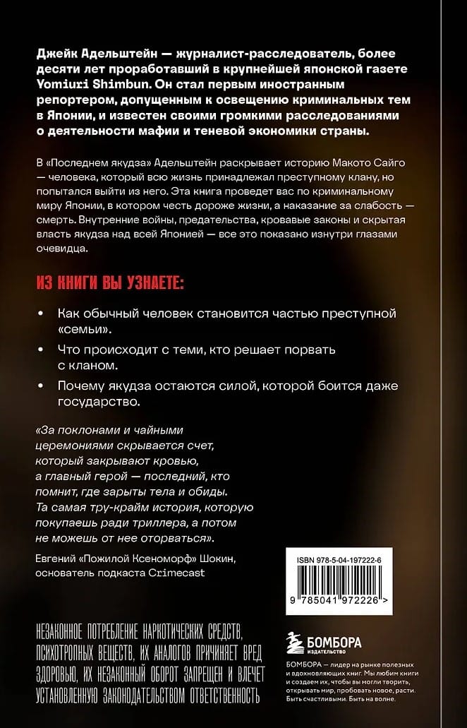 В «Последнем якудза» Адельштейн раскрывает историю Макото Сайго — человека, который всю жизнь принадлежал преступному клану, но попытался выйти из него. Эта книга проведет вас по криминальному миру Японии, в котором честь дороже жизни, а наказание за слабость — смерть. Внутренние войны, предательства, кровавые законы и скрытая власть якудза над всей Японией — все это показано изнутри глазами очевидца.