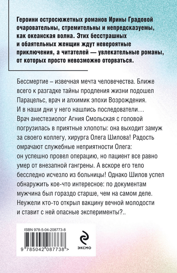 Бессмертие — извечная мечта человечества. Ближе всего к разгадке тайны продления жизни подошел Парацельс, врач и алхимик эпохи Возрождения. И в наши дни у него нашлись последователи… Врач-анестезиолог Агния Смольская с головой погрузилась в приятные хлопоты: она выходит замуж за своего коллегу, хирурга Олега Шилова! Радость омрачают служебные неприятности Олега: он успешно провел операцию, но пациент все равно умер от внезапной гангрены. А вскоре его тело бесследно исчезло из больницы! Однако Шилов успел обнаружить кое-что интересное: по документам мужчина был гораздо старше, чем на самом деле. Неужели кто-то открыл вакцину вечной молодости и ставит с ней опасные эксперименты?..