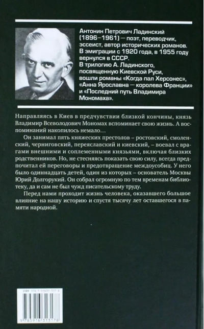 Антонин Петрович Ладинский (1896-1961) - поэт, переводчик, эссеист, автор исторических романов. В эмиграции с 1920 года, в 1955 году вернулся в СССР. В трилогию А. Ладинского, посвященную Киевской Руси, вошли романы «Когда пал Херсонес», «Анна Ярославна - королева Франции» и «Последний путь Владимира Мономаха». Направляясь в Киев в предчувствии близкой кончины, князь Владимир Всеволодович Мономах вспоминает свою жизнь. А воспоминаний накопилось немало...