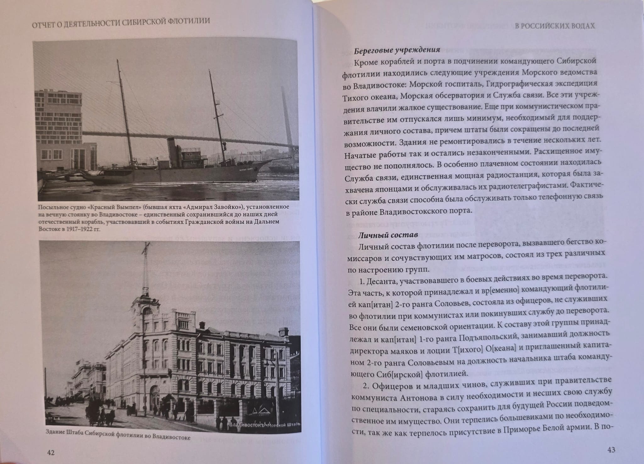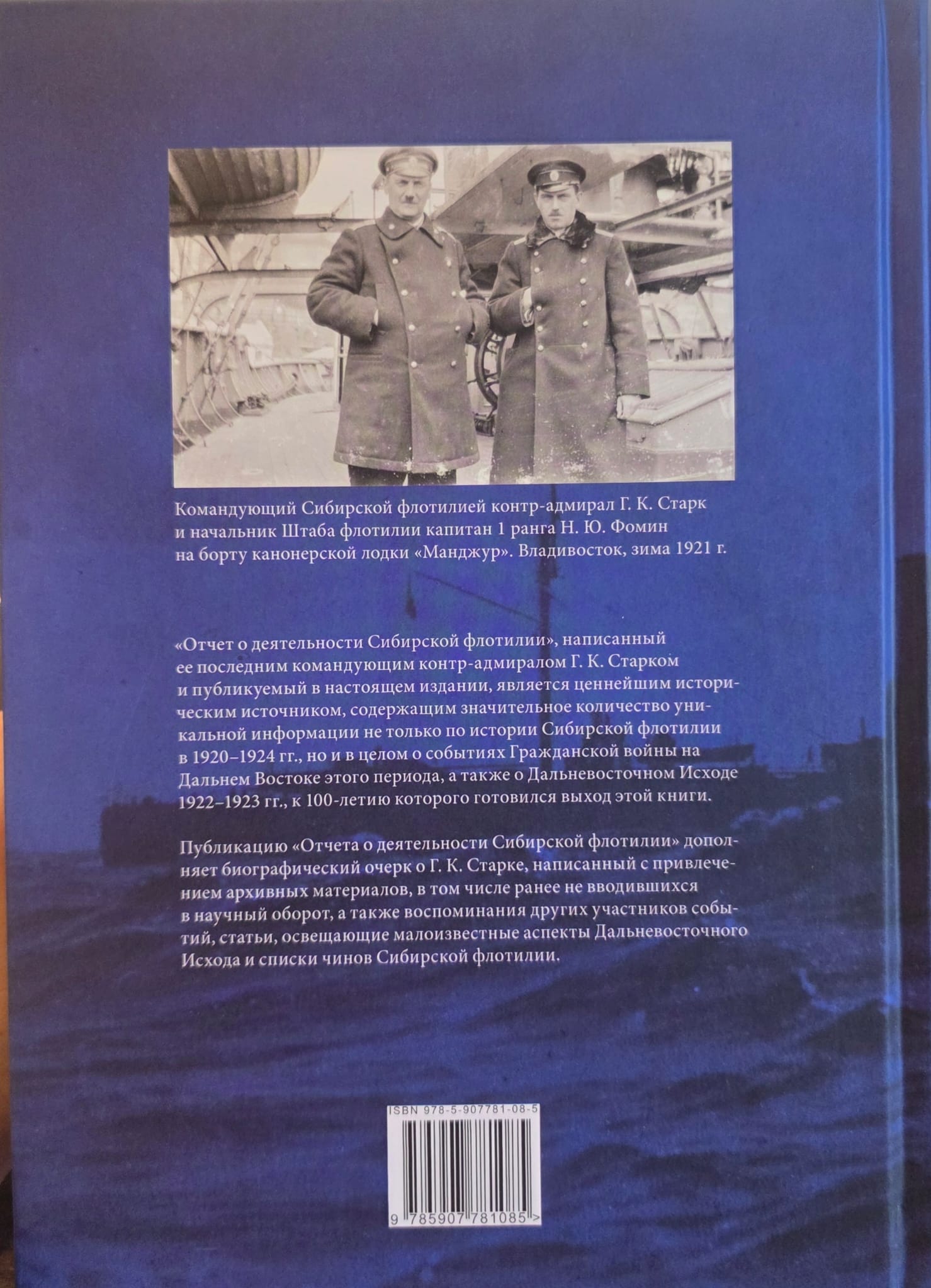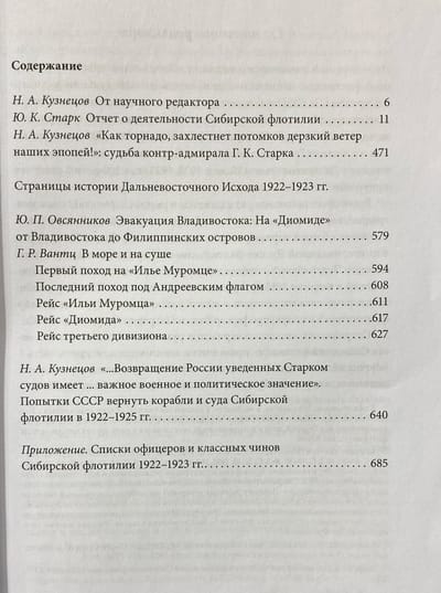 «Отчет о деятельности Сибирской флотилии», написанный ее последним командующим контр-адмиралом Г. К. Старком и публикуемый в настоящем издании, является ценнейшим историческим источником, содержащим значительное количество уникальной информации не только по истории Сибирской флотилии в 1920-1924 гг., но и в целом о событиях Гражданской войны на Дальнем Востоке этого периода, а также о Дальневосточном Исходе 1922-1923 гг., к 100-летию которого готовился выход этой книги. Публикацию «Отчета о деятельности Сибирской флотилии» дополняет биографический очерк о Г. К. Старке, написанный с привлечением архивных материалов, в том числе ранее не вводившихся в научный оборот, а также воспоминания других участников событий, статьи, освещающие малоизвестные аспекты Дальневосточного Исхода и списки чинов Сибирской флотилии.