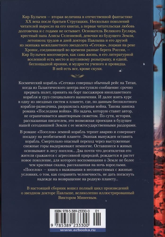 Кир Булычев — вторая величина в отечественной фантастике XX века после братьев Стругацких. Несколько поколений читателей выросло на его книгах, а первая читательская любовь долговечна и с годами не остывает. Основатель Великого Гусляра (своеобразного аналога северного города Соловца со знаменитым НИИЧАВО и его сотрудниками), крестный папа Алисы Селезневой, девочки из будущего Земли, летописец трудов и дней доктора Павлыша и его друзей из экипажа межпланетного звездолета «Сегежа», лоцман на реке Хронос, соединяющей во времени разные берега России, — Кир Булычев многомерен, как сама жизнь, в его литературной вселенной есть место и шутливому розыгрышу, и едкой, беспощадной иронии, и мудрости ученого и провидца. В ней есть все, кроме скуки. Космический корабль «Сегежа» совершал обычный рейс на Титан с грузом шахтного оборудования, когда из Галактического центра поступила радиограмма: срочно прервать полет, принять на борт пассажиров инопланетного корабля и груз специального назначения. И далее взять курс в одну из звездных систем к планете, где, по данным беспилотного корабля-разведчика, разразилась ядерная война. Почему туда послали землян? Потому что, судя по обнаруженным изображениям жителей мертвой планеты, внешне они схожи с людьми. А груз специального назначения — это устройство, созданное расой корон для восстановления мертвого тела. В романе «Поселок» корабль «Полюс» терпит аварию и совершает посадку на необитаемой планете. Экипаж вынужден оставить корабль, причина — высокая радиация в результате взрыва реактора. Смертельно опасный переход через выстуженные снежные горы в спасительный, казалось бы, лес выдерживают немногие. Оставшиеся в живых основывают в лесу поселок… Почти два десятилетия его жители сражаются с агрессивной природой, рождается и растет новое поколение, для которого воспоминания о Земле не более чем красивая сказка, рассказанная на ночь взрослыми. В настоящий сборник вошел полный цикл произведений о звездном докторе Павлыше. Книга проиллюстрирована работами художника Виктора Минеева.