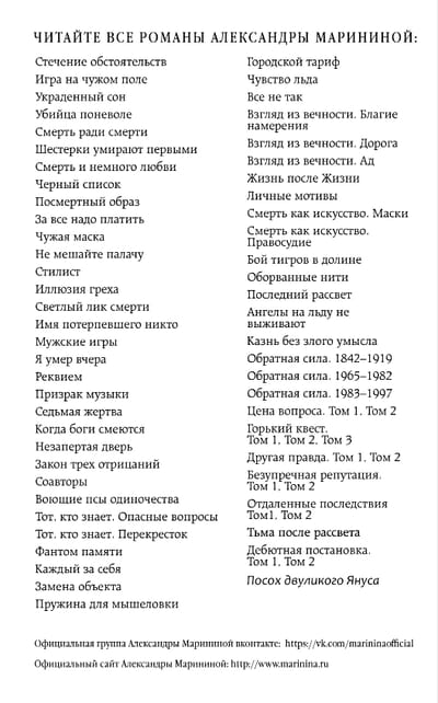 В этом романе Александра Маринина остаётся верна себе — точная психология, острое социальное чутьё и цепкий детективный нерв. Однако автор впервые вплетает в повествование сюжетную линию из будущего. Благодаря этому можно взглянуть на преступление так, как его увидят через десятки лет, когда правда уже никому не нужна.